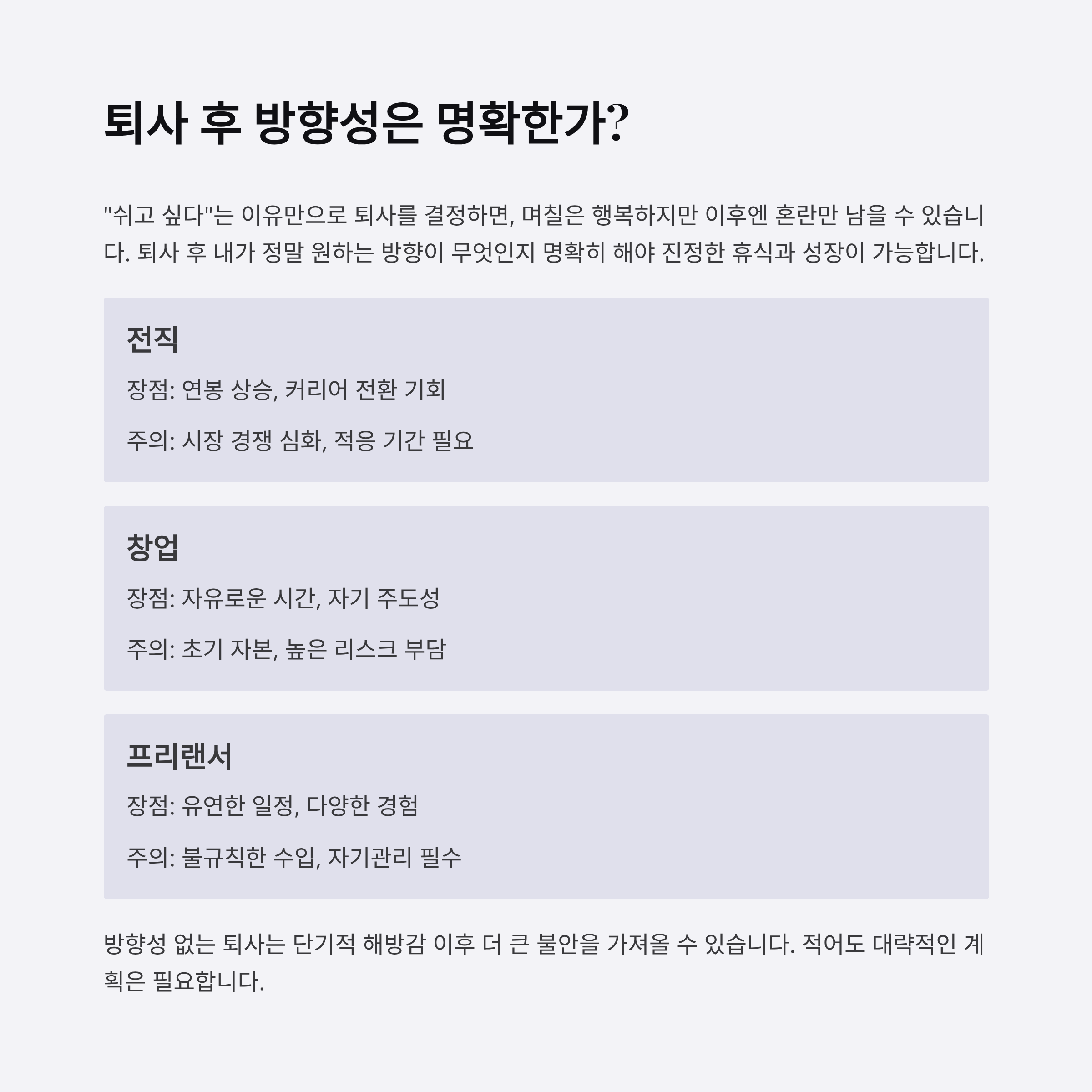 "쉬고 싶다"는 이유만으로 퇴사를 결정하면, 며칠은 행복하지만 이후엔 혼란만 남아요. 퇴사 후 내가 하고 싶은 일이 뭔지, 어디로 갈 건지 대략적인 그림이라도 그려놔야 진짜 의미 있는 휴식이 됩니다. 전직? 창업? 프리랜서? 공부? 선택지는 많지만, 그만큼 각자의 리스크도 달라요.