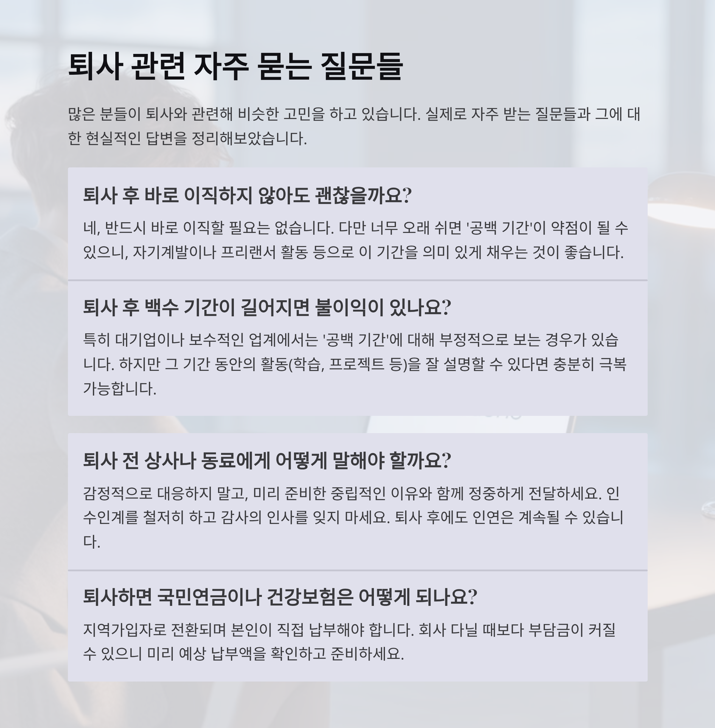 퇴사 후의 삶은 누구에게나 '모험'입니다. 인스타에 올라오는 "퇴사하고 세계일주 중~✈️" 같은 화려한 장면 뒤에는 수많은 고민과 후회가 숨어있을 수도 있어요. 여기, 실제로 퇴사한 분들의 리얼한 후기를 공유합니다.