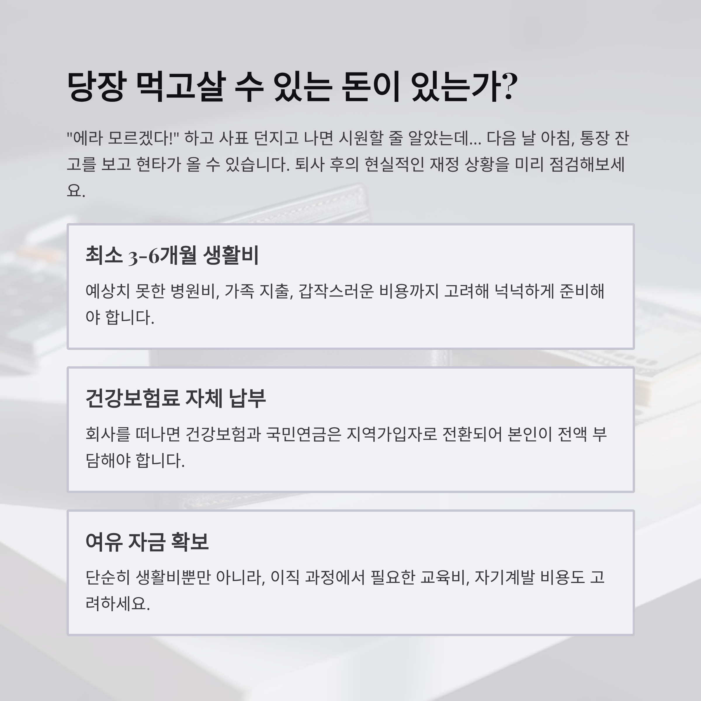 "에라 모르겠다!" 하고 사표 던지고 나면 시원할 줄 알았죠. 근데 그 다음 날 아침, 통장 잔고를 보고 현타 오는 거... 솔직히 무섭잖아요. 최소한 3~6개월 치 생활비는 있어야 '마음 편하게 백수 생활'이 가능해요. 예상치 못한 병원비, 가족 지출, 혹은 갑자기 잡히는 기회비용까지 고려해서 넉넉하게 준비해두는 게 좋습니다.