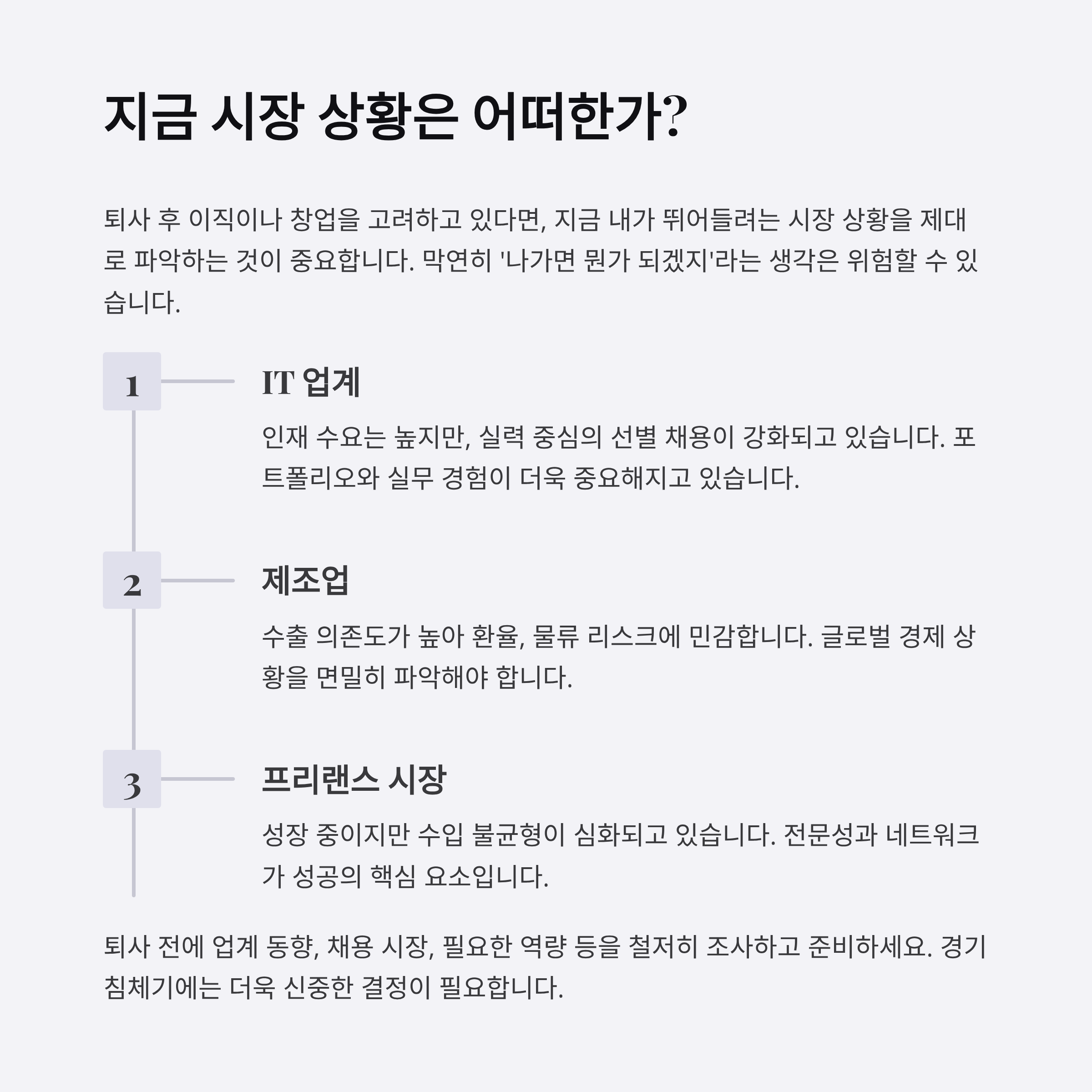 퇴사 후 이직이나 창업을 고려하고 있다면, 지금 내가 뛰어들려는 시장 상황을 제대로 파악하는 게 먼저예요. 막연히 '나가면 뭔가 되겠지'라는 생각은 너무 위험합니다. 채용 트렌드, 경기 전망, 산업별 변동성 등은 퇴사 시기를 결정하는 중요한 지표가 될 수 있어요.