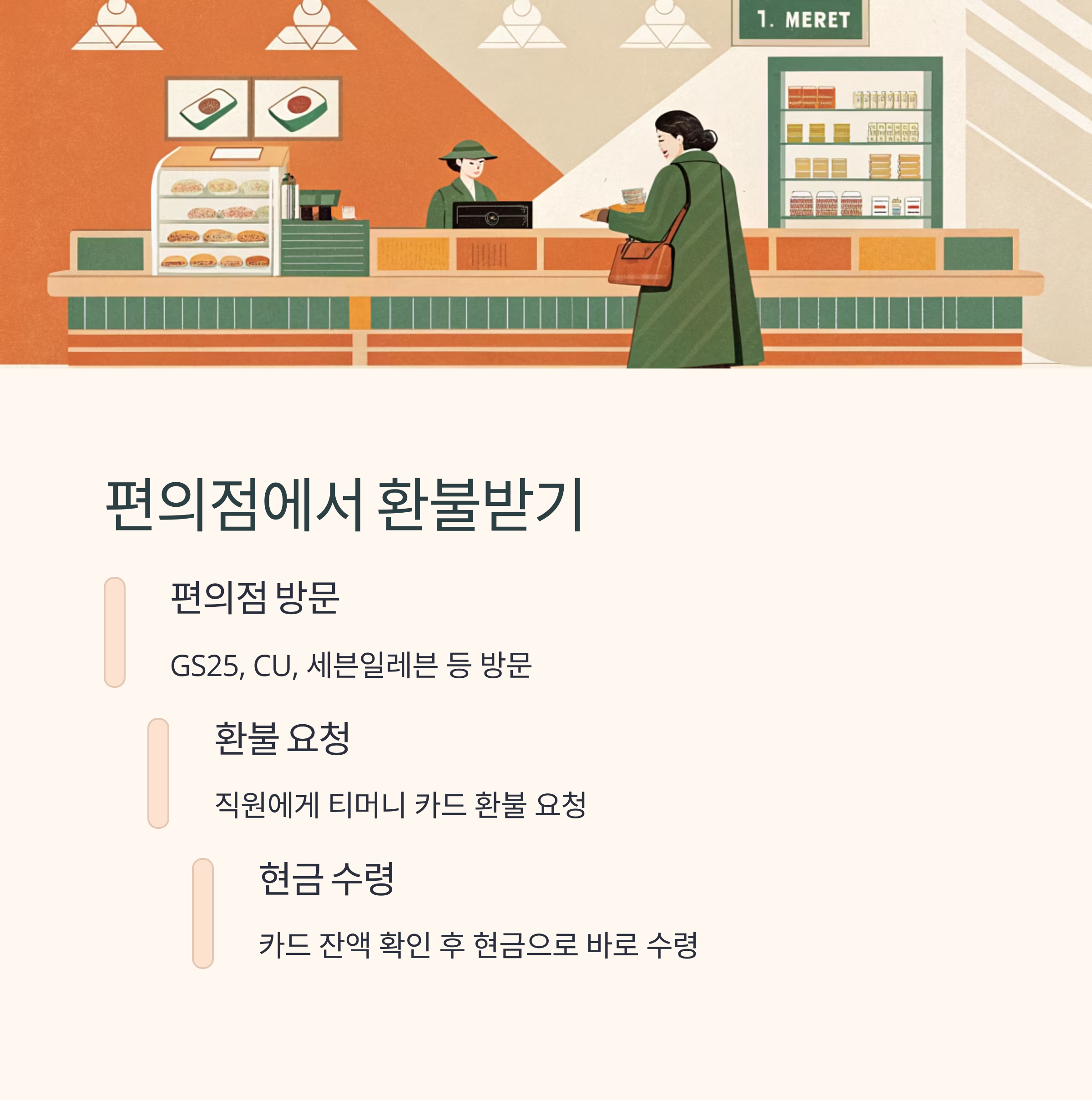 카드형 티머니의 경우 가까운 편의점이나 지하철 역사 내 무인환불기 또는 고객센터에서 환불을 받을 수 있어요. 아래는 환불 절차예요.