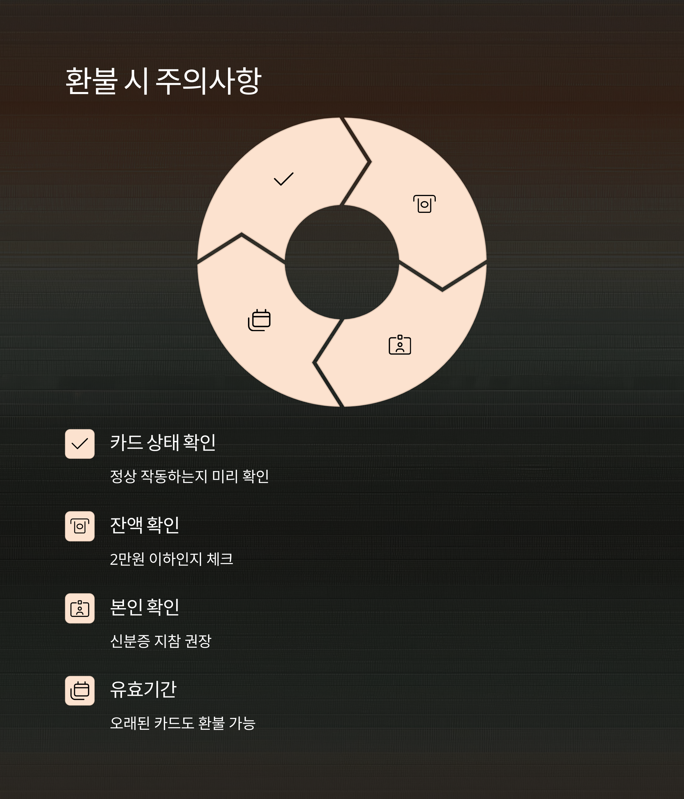 - 카드가 손상되었을 경우 환불 불가 또는 지연 발생