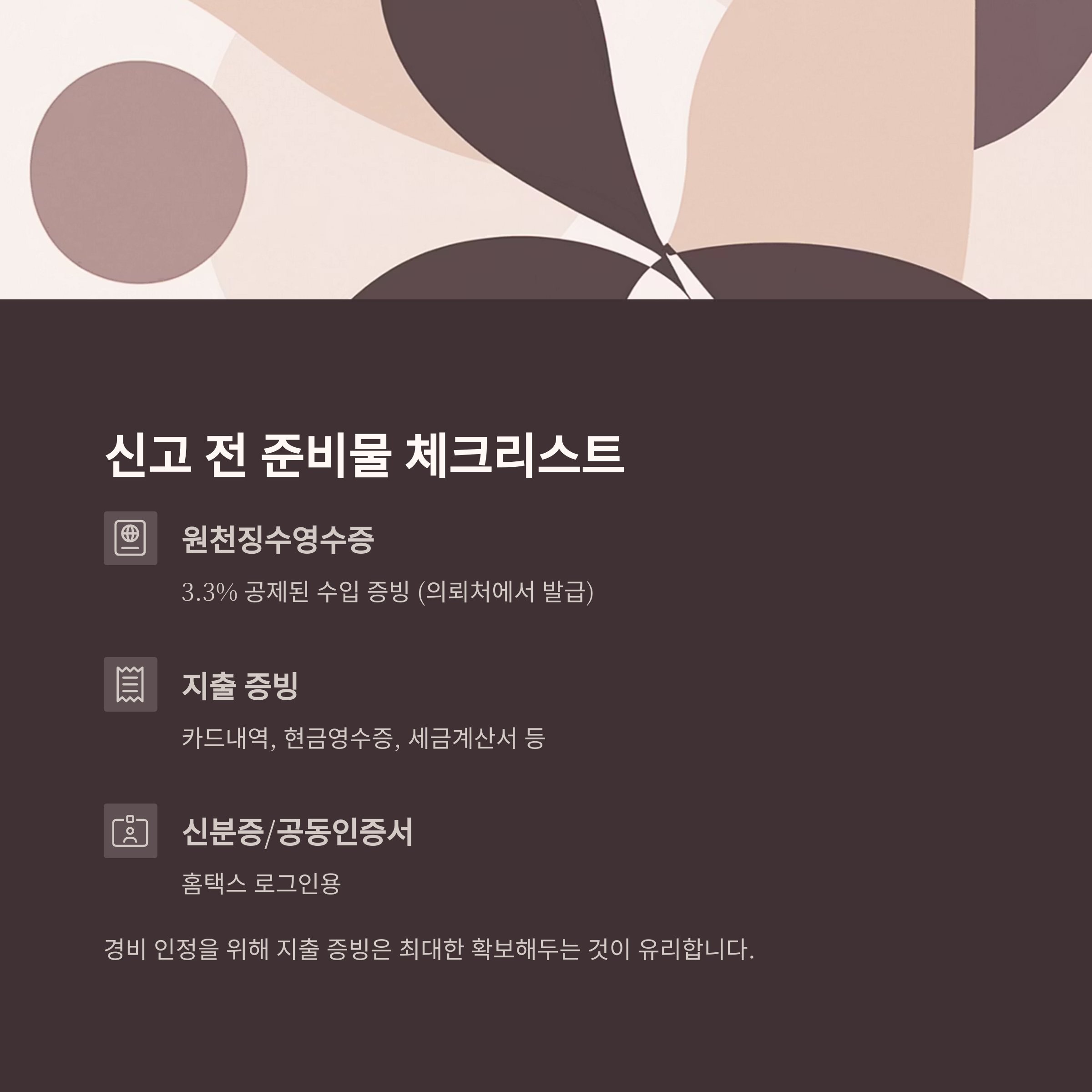 | 신분증/공동인증서 | 필수 | 홈택스 로그인용 |