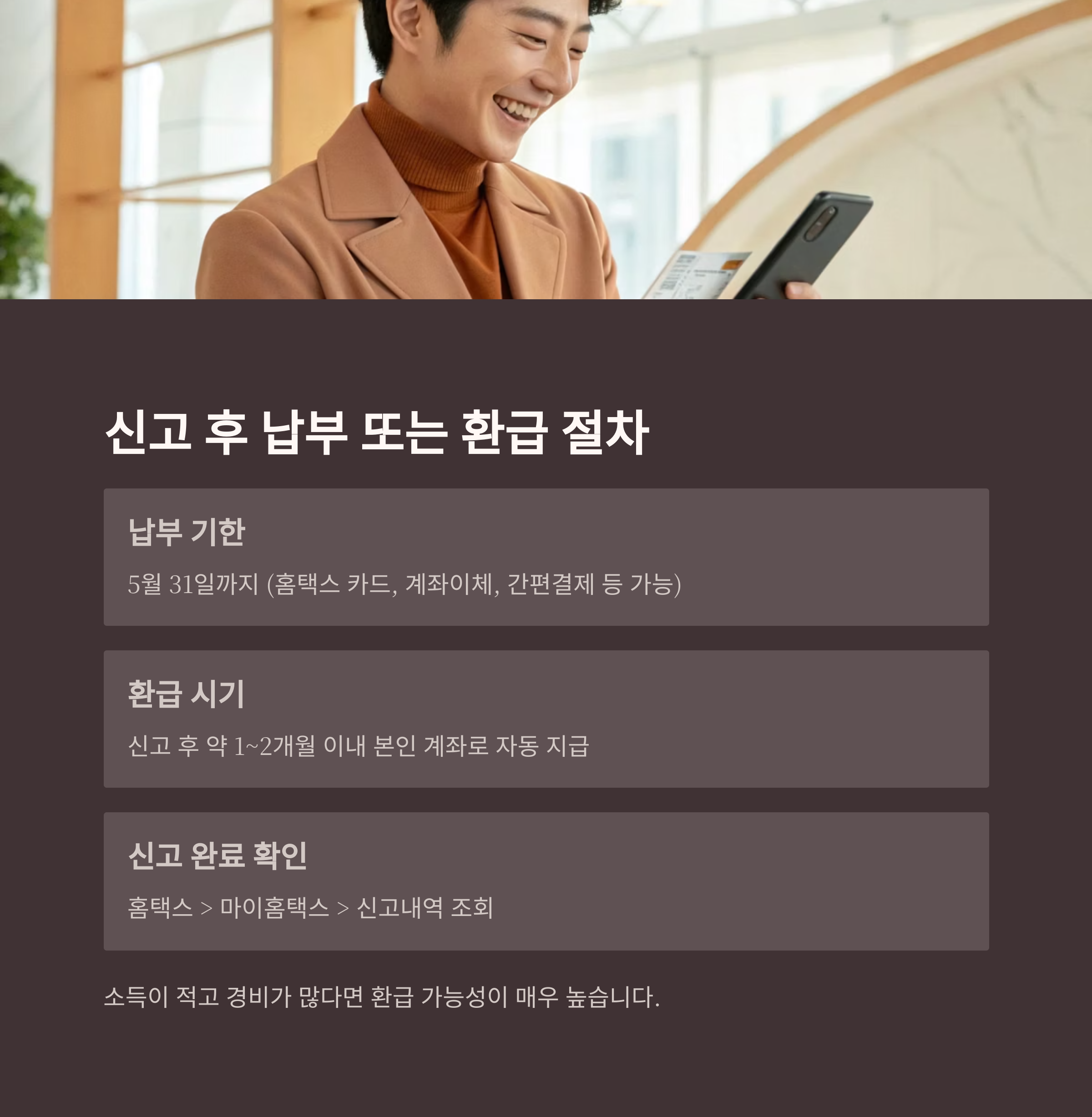 - 납부 기한: 5월 31일까지 (홈택스 카드, 계좌이체, 간편결제 등 가능)