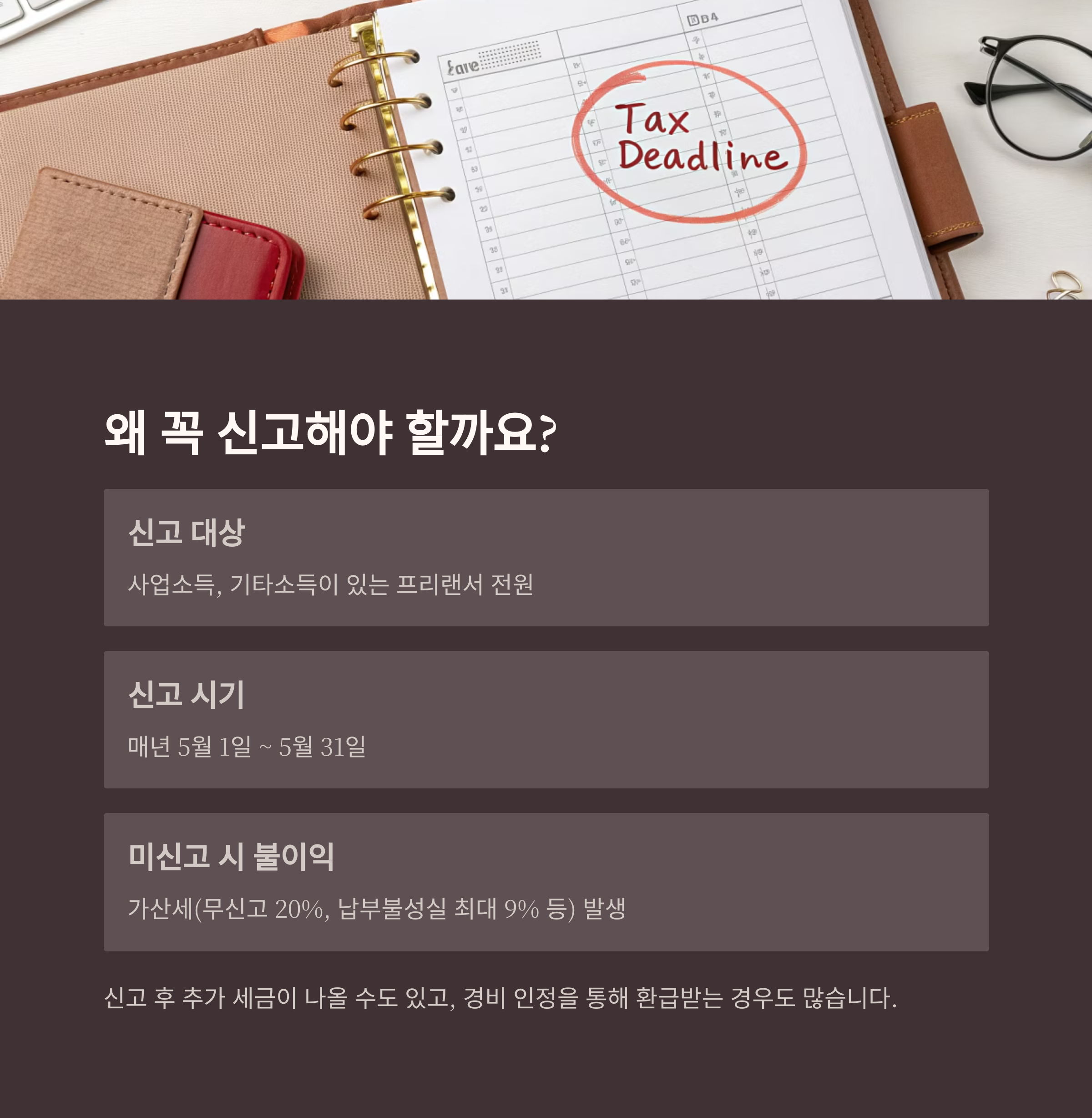 | 미신고 시 불이익 | 가산세(무신고 20%, 납부불성실 최대 9% 등) 발생 |
