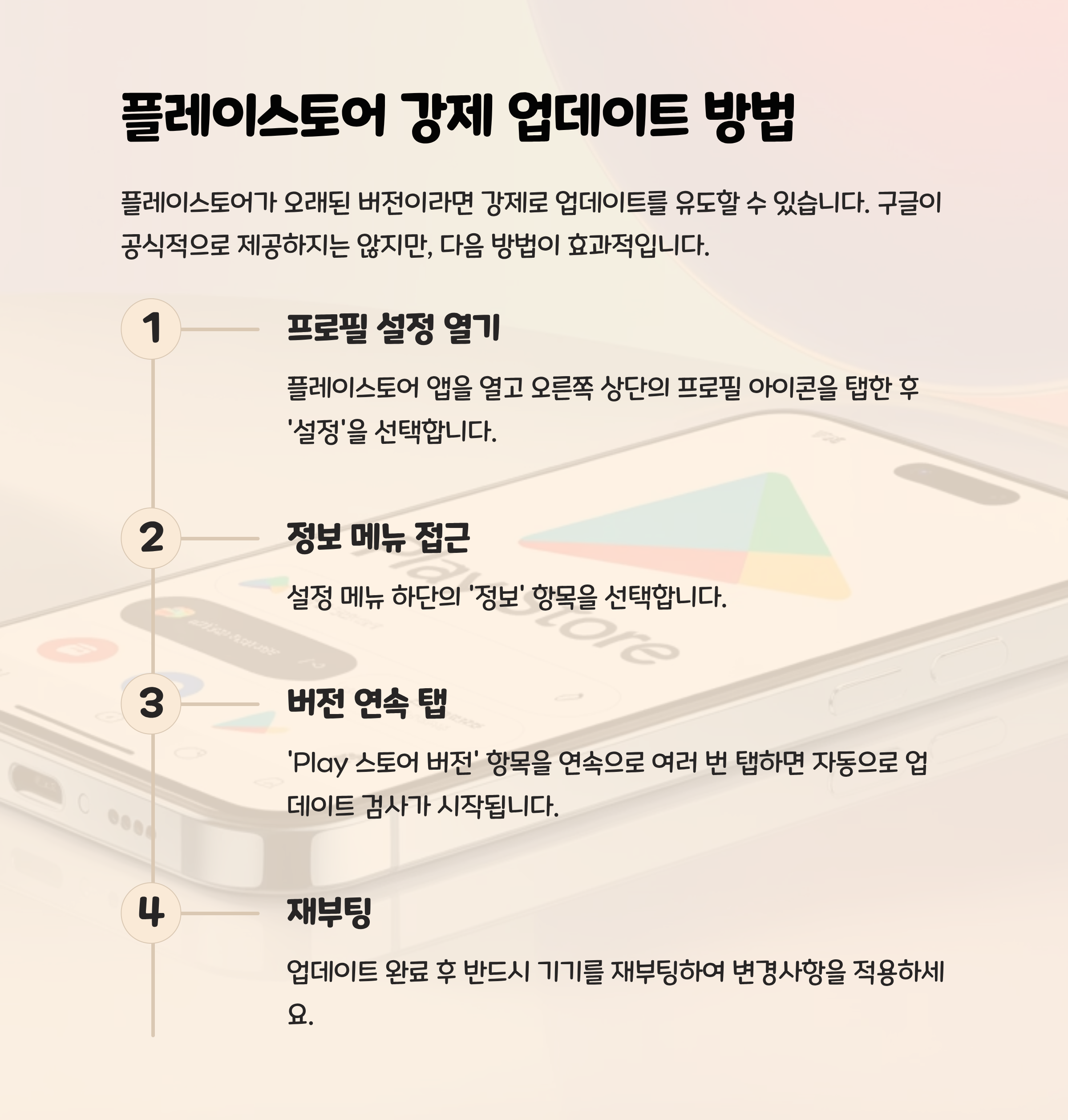 기기에 따라 플레이스토어가 자동으로 업데이트되지 않아 발생하는 문제도 많아요. 이럴 땐 수동으로 업데이트를 유도해보세요. 구글이 공식적으로 제공하진 않지만, 다음과 같은 방법이 있어요.