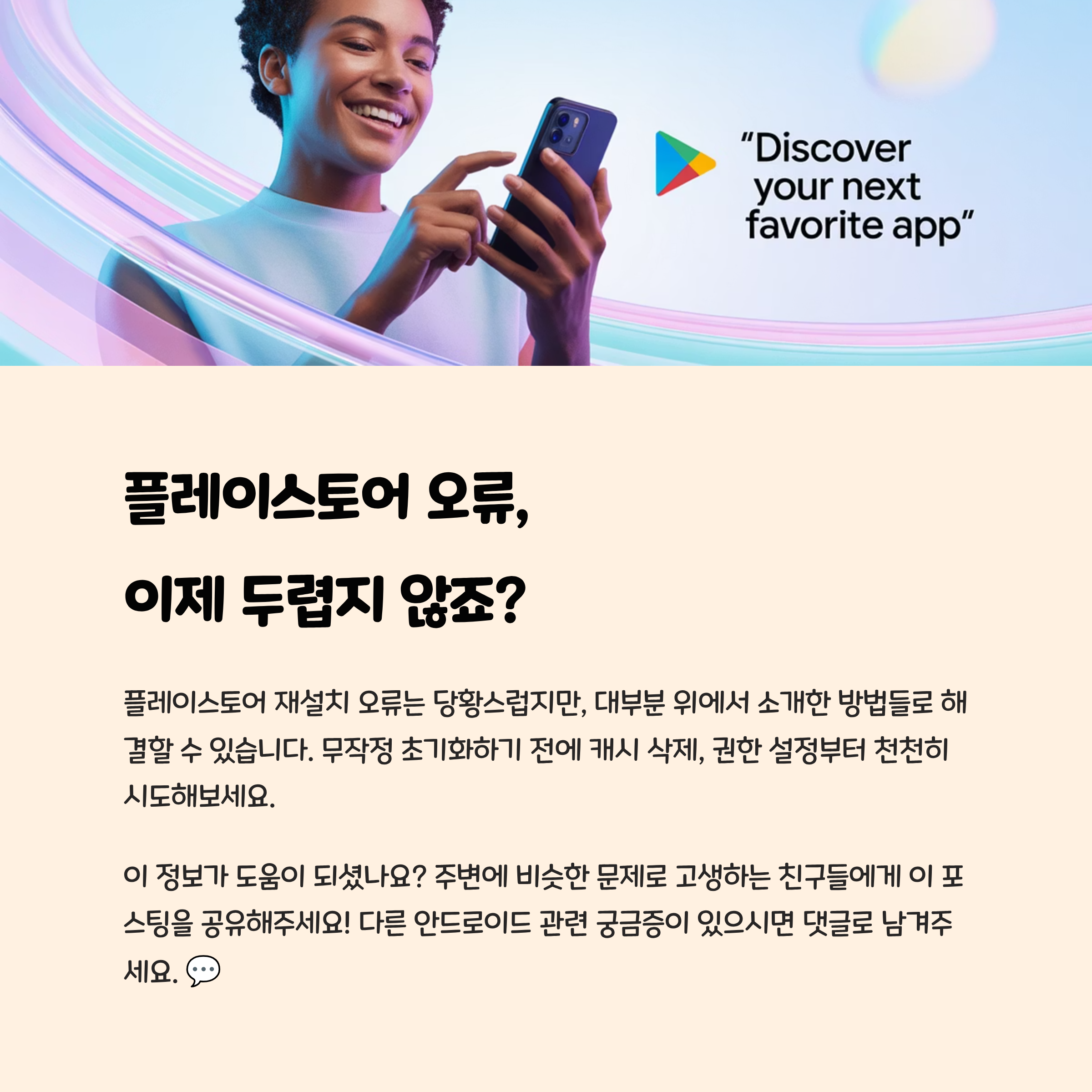 플레이스토어 오류, 참 답답하고 당황스럽죠. 하지만 대부분은 위에서 소개한 몇 가지 방법만으로도 금방 해결되는 경우가 많아요. 무작정 초기화하기 전에 캐시 삭제, 권한 설정부터 꼼꼼히 확인해보시길 추천드립니다. 저처럼 시행착오 겪지 마시고, 오늘 이 글이 작은 해결책이 되었으면 좋겠어요 :)