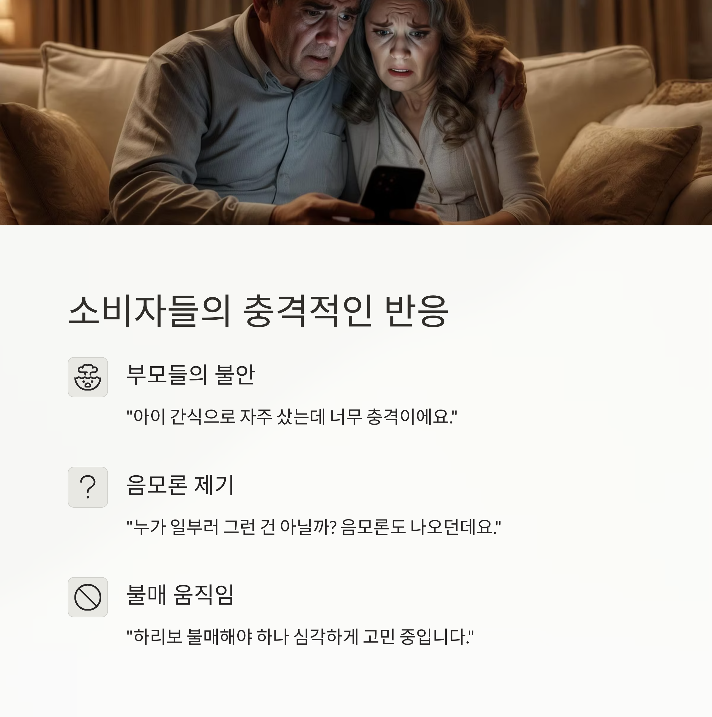 이 사태에 대해 소비자들의 반응은 폭발적입니다. SNS와 커뮤니티 사이트에는 다양한 의견이 올라오고 있으며, 특히 부모들의 불안감이 커지고 있는 상황입니다.