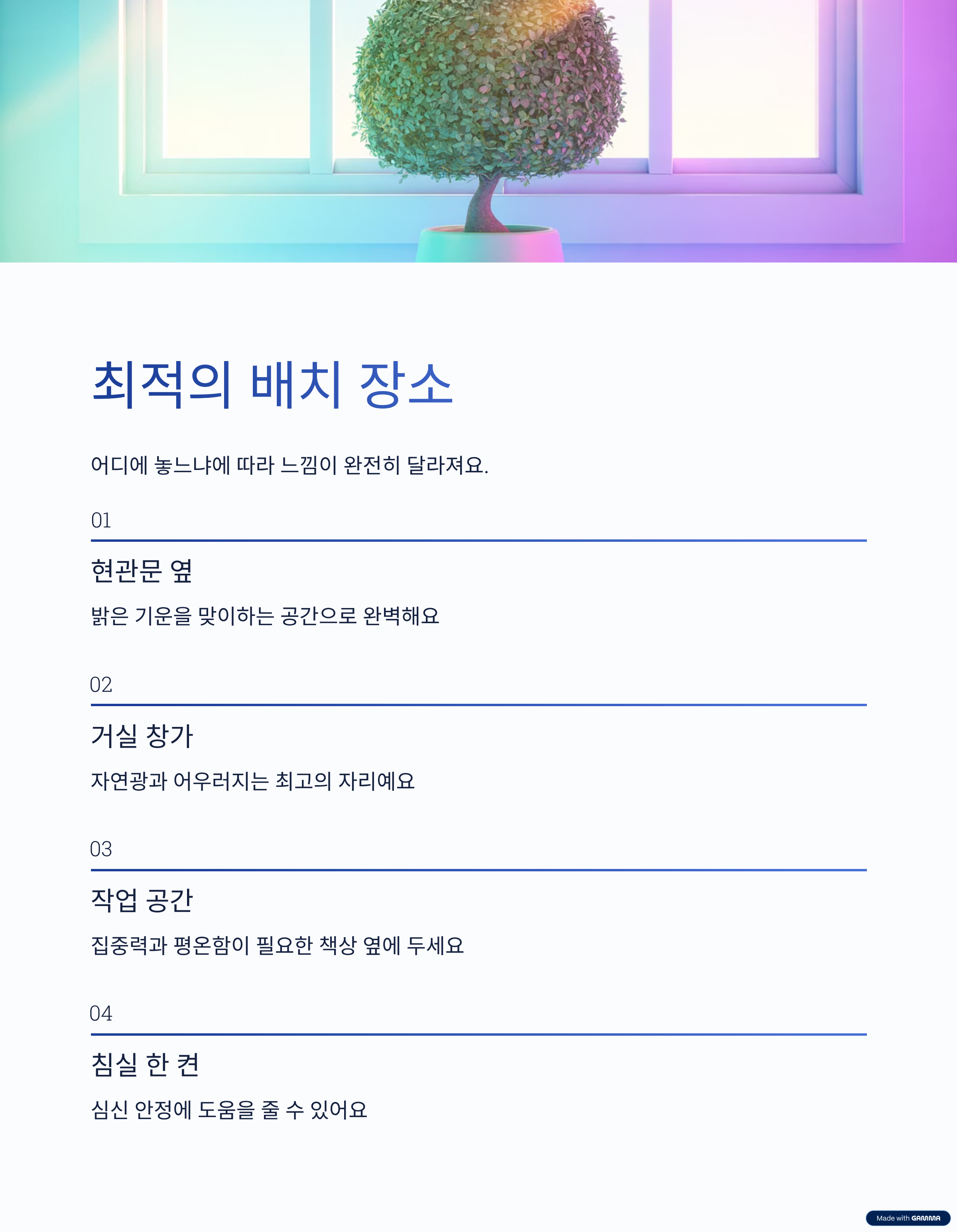 해피트리는 어디에 놓느냐에 따라 그 느낌이 완전히 달라져요. 아래 추천 장소들을 참고해보세요.