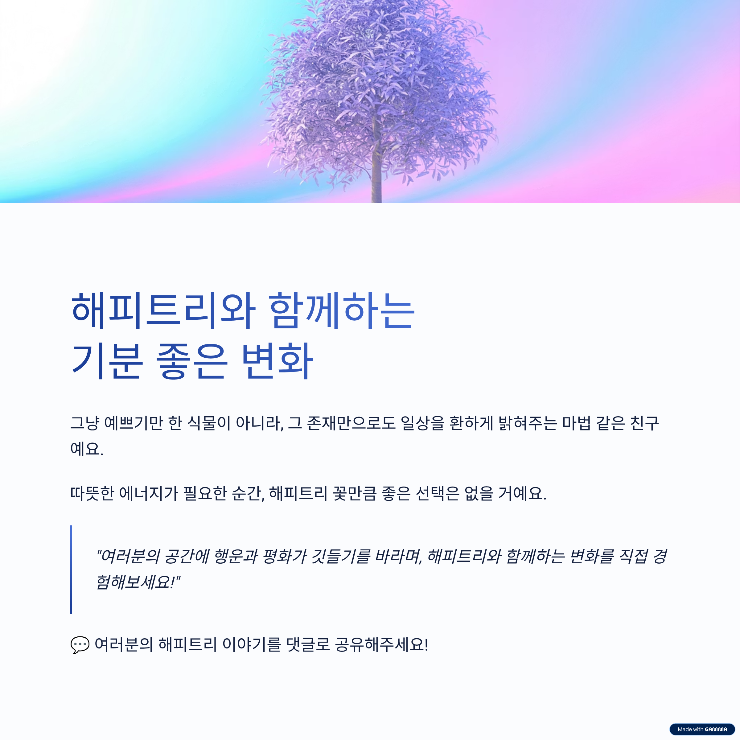 지금 이 순간, 여러분의 공간에 따뜻한 에너지가 필요하다면 해피트리 꽃만큼 좋은 선택은 없을지도 몰라요. 그냥 예쁘기만 한 식물이 아니라, 그 존재만으로도 일상을 환하게 밝혀주는 마법 같은 친구거든요. 오늘 제가 공유한 팁과 정보들이 여러분에게 작은 영감이 되었길 바라며, 해피트리와 함께하는 기분 좋은 변화, 직접 경험해보셨으면 좋겠어요. 혹시 해피트리 꽃과 관련해 궁금한 점이나 여러분만의 이야기가 있다면 댓글로 꼭 남겨주세요. 함께 나누는 이야기 속에 더 많은 행운이 깃들 거예요!