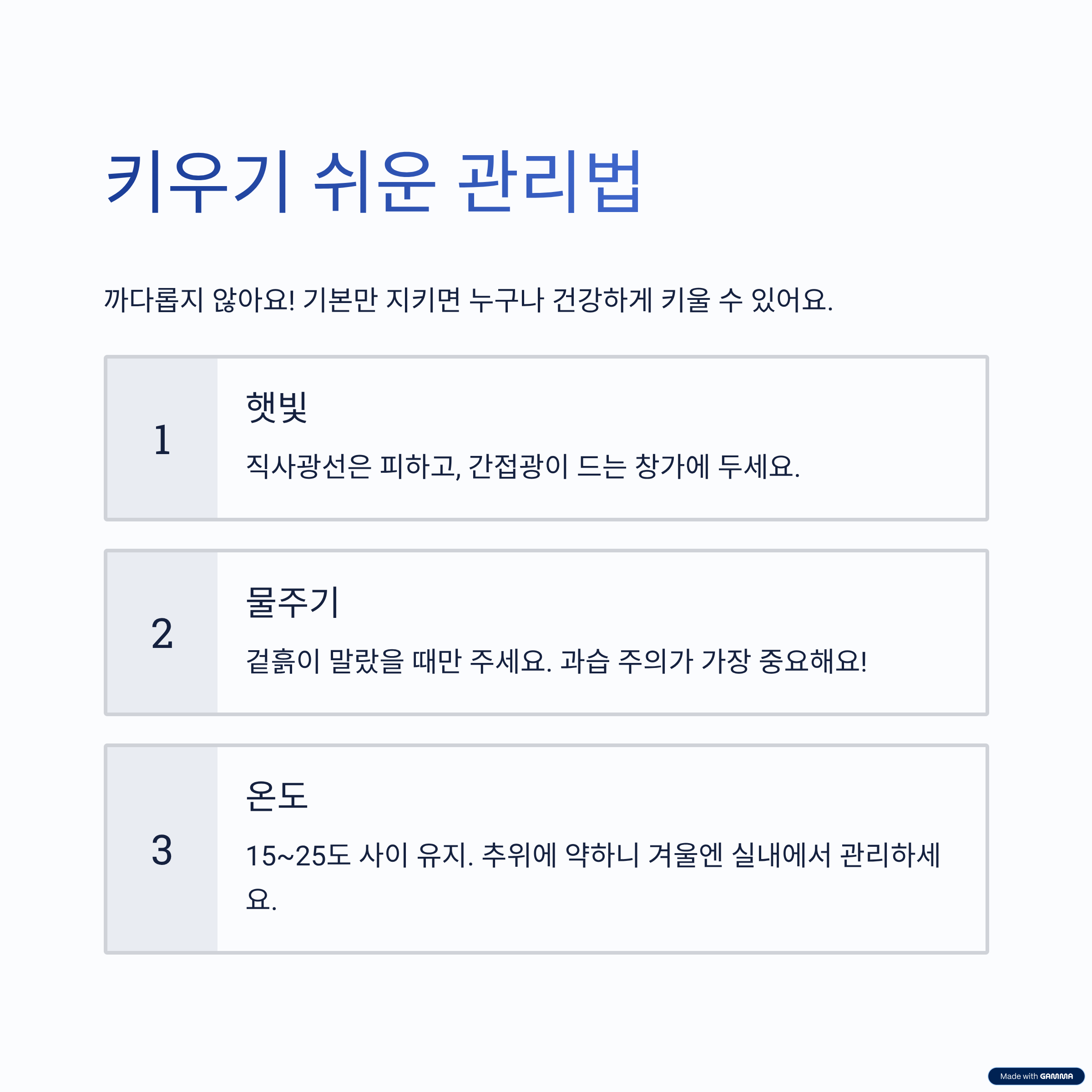 꽃이 피는 식물이라고 하면 왠지 까다롭게 느껴질 수도 있지만, 해피트리는 생각보다 관리가 쉬운 편이에요. 물론 몇 가지 기본 조건은 꼭 챙겨야겠죠.