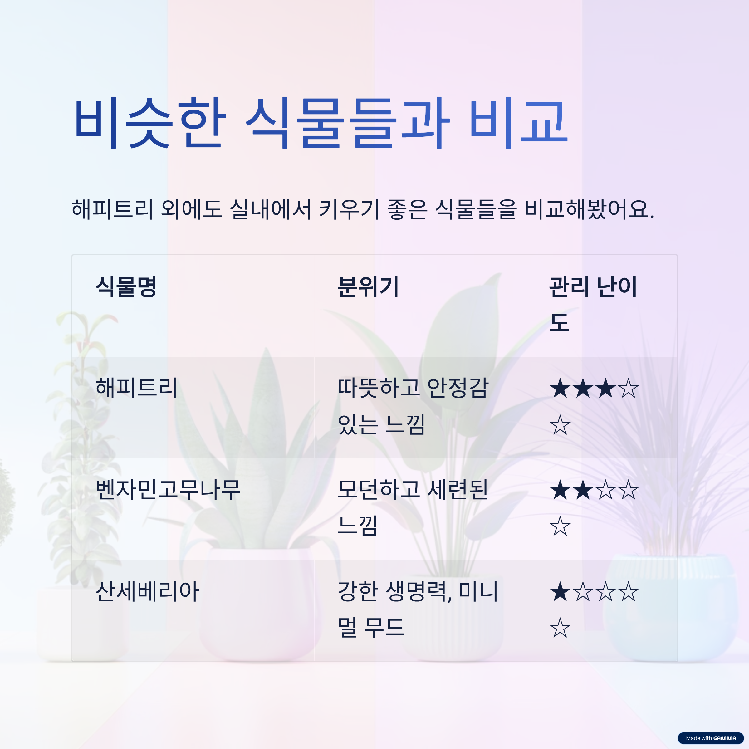 해피트리 외에도 비슷한 분위기를 주는 실내 식물이 몇 가지 있어요. 아래 표에서 주요 특징을 비교해봤어요.