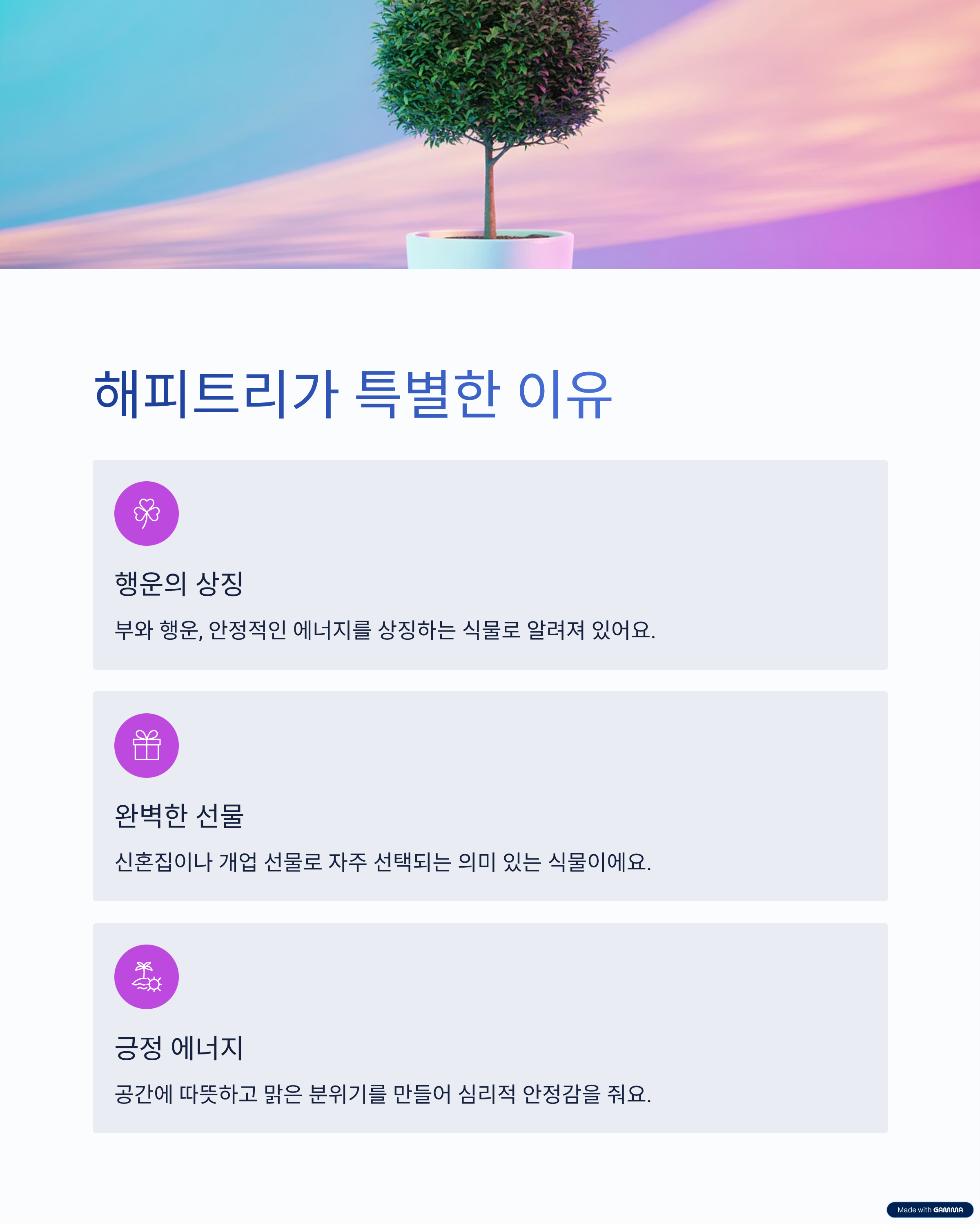 해피트리(Happy Tree)는 이름처럼 '행복을 가져다주는 식물'이라는 이미지로 많은 사람들의 사랑을 받고 있어요. 특히 꽃이 피는 시기가 되면 마치 기분 좋은 일이 일어날 것 같은 예감이 들죠. 해피트리 꽃은 부와 행운, 안정적인 에너지를 상징한다고 알려져 있어요. 그래서 신혼집이나 개업 선물로도 자주 등장하죠. 저도 누가 해피트리를 선물해줬을 땐, 그냥 예쁜 식물이라 생각했는데, 알고 보니 그 속에 꽤 깊은 의미가 담겨 있더라구요.