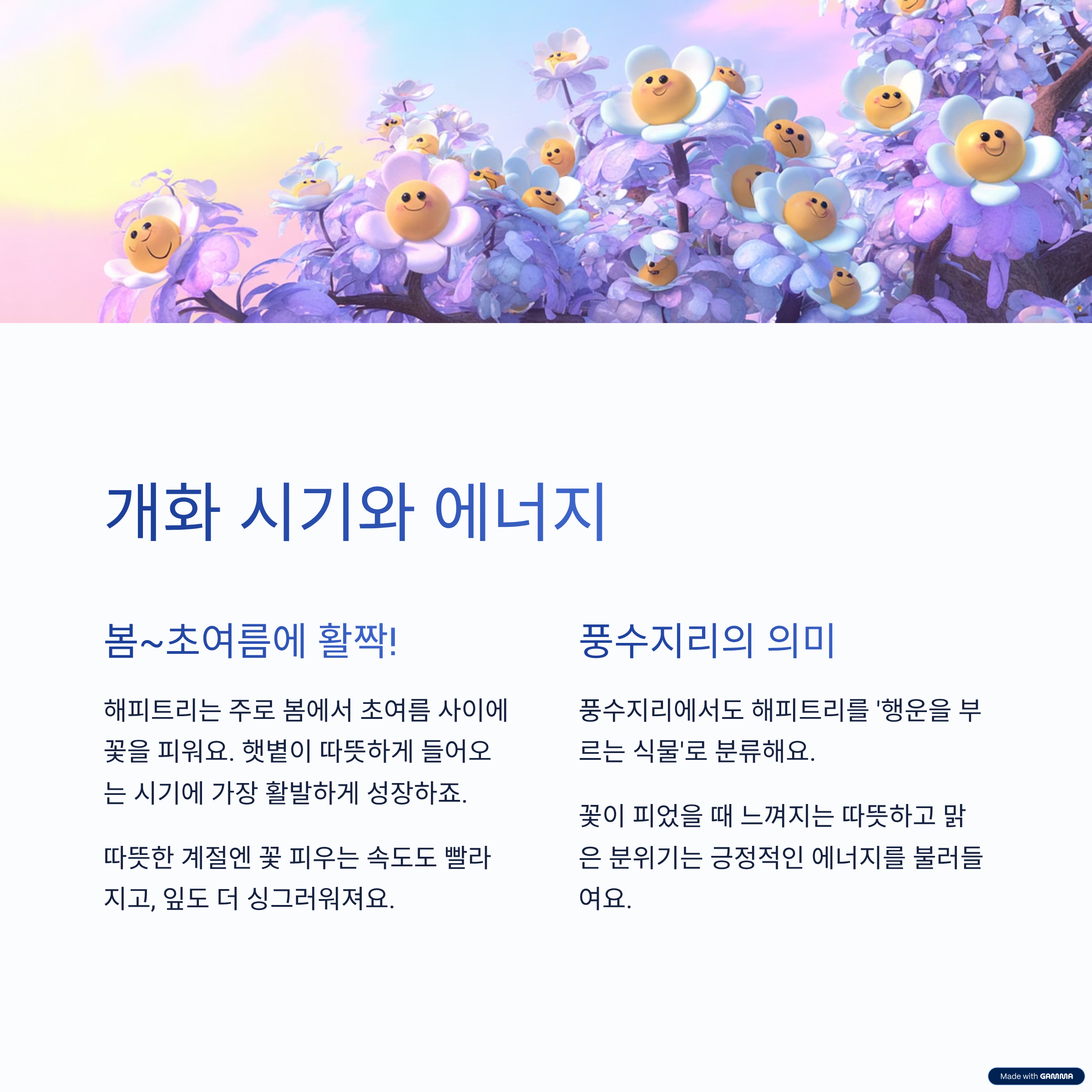 해피트리는 주로 봄에서 초여름 사이에 꽃을 피웁니다. 햇볕이 따뜻하게 들어오는 시기에 가장 활발하게 성장하죠.