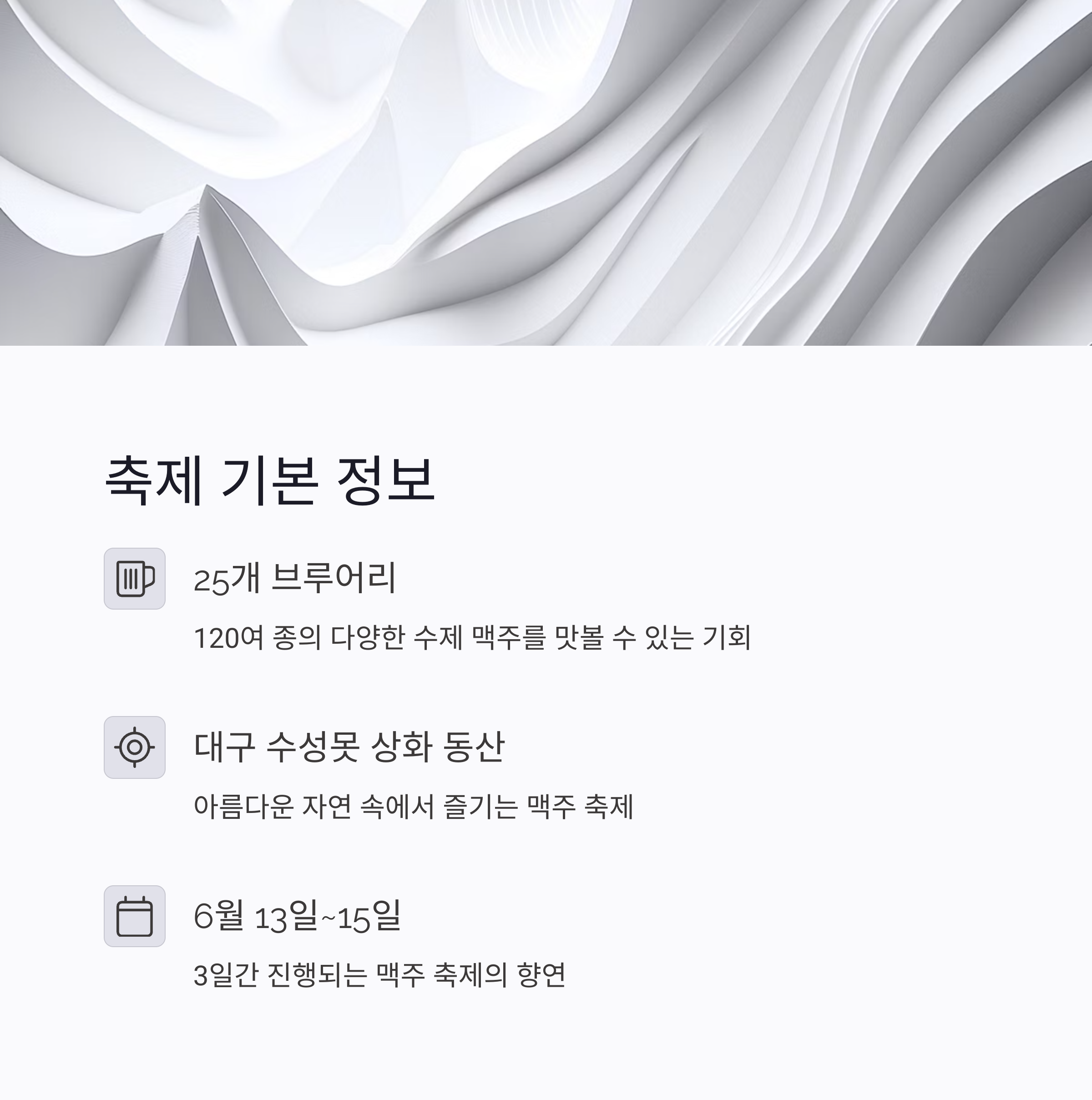2025 ๋๊ตฌ ์์ ๋งฅ์ฃผ ํ์คํฐ๋ฒ, ์์ํ ๋งฅ์ฃผ์ ๋ค์ฑ๋ก์ด ๊ณต์ฐ์ผ๋ก ์ฌ์ฌ๋ฆ ์ต๊ณ ์ ์ถ์ต์ ๋ง๋ค์ด๋ณด์ธ์! ๐