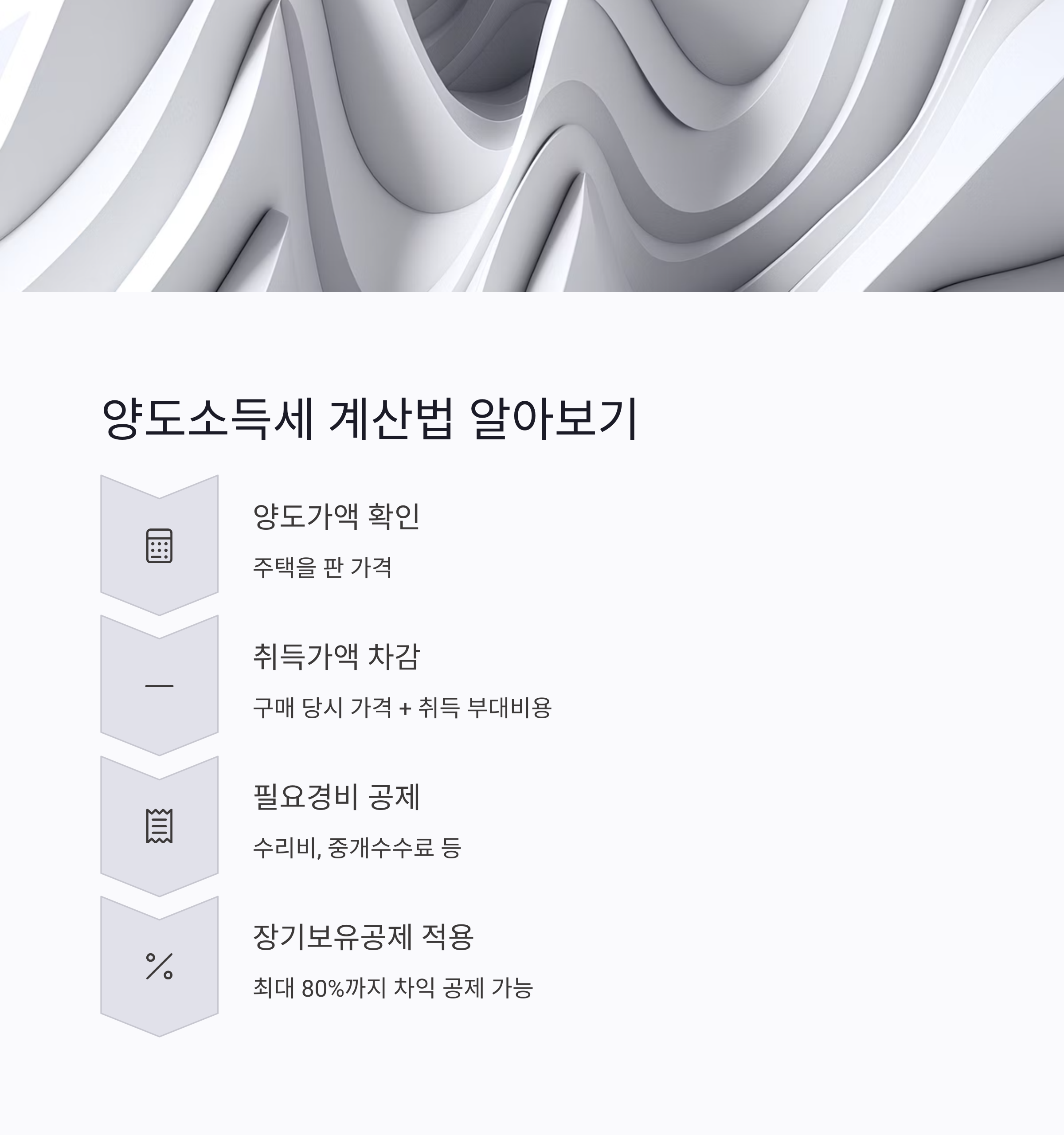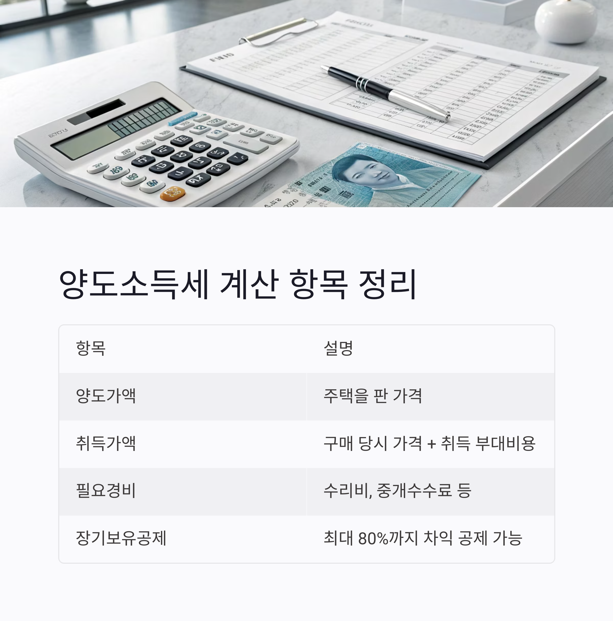 양도소득세 계산은 단순히 매도가격에서 매입가격을 뺀 ‘차익’으로 끝나지 않아요. 취득세, 등록세, 중개 수수료 등도 필요경비로 공제할 수 있고, 보유기간에 따라 장기보유특별공제도 적용됩니다. 아래 표는 기본 계산 구조를 정리한 것이에요.
