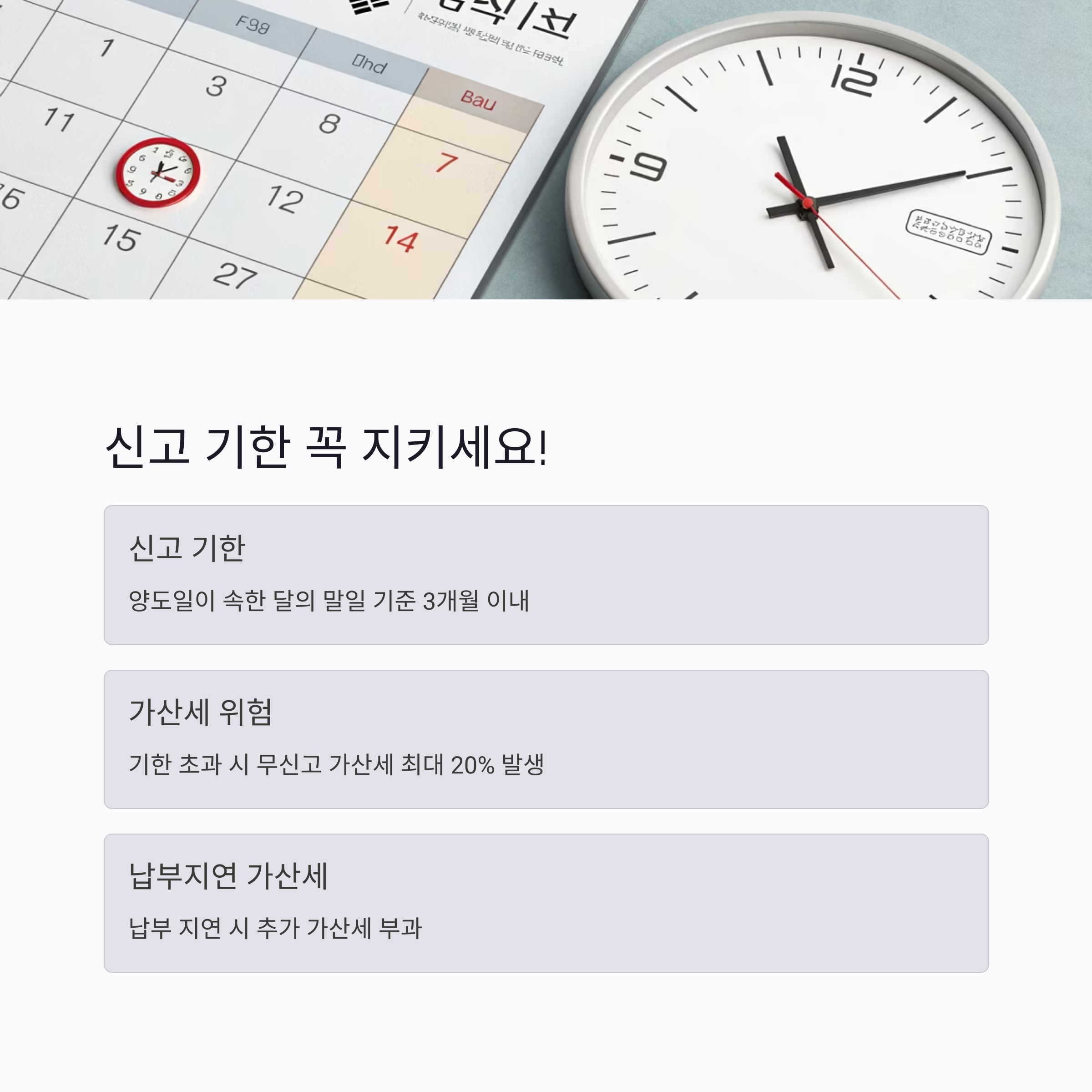 양도일이 속한 달의 말일 기준 3개월 이내에 신고 및 납부를 완료해야 해요. 예를 들어 5월 15일에 주택을 매도했다면 8월 31일까지입니다. 이를 넘기면 무신고 가산세(최대 20%)와 납부지연 가산세가 발생할 수 있어요. 꼭 달력에 표시해두세요!