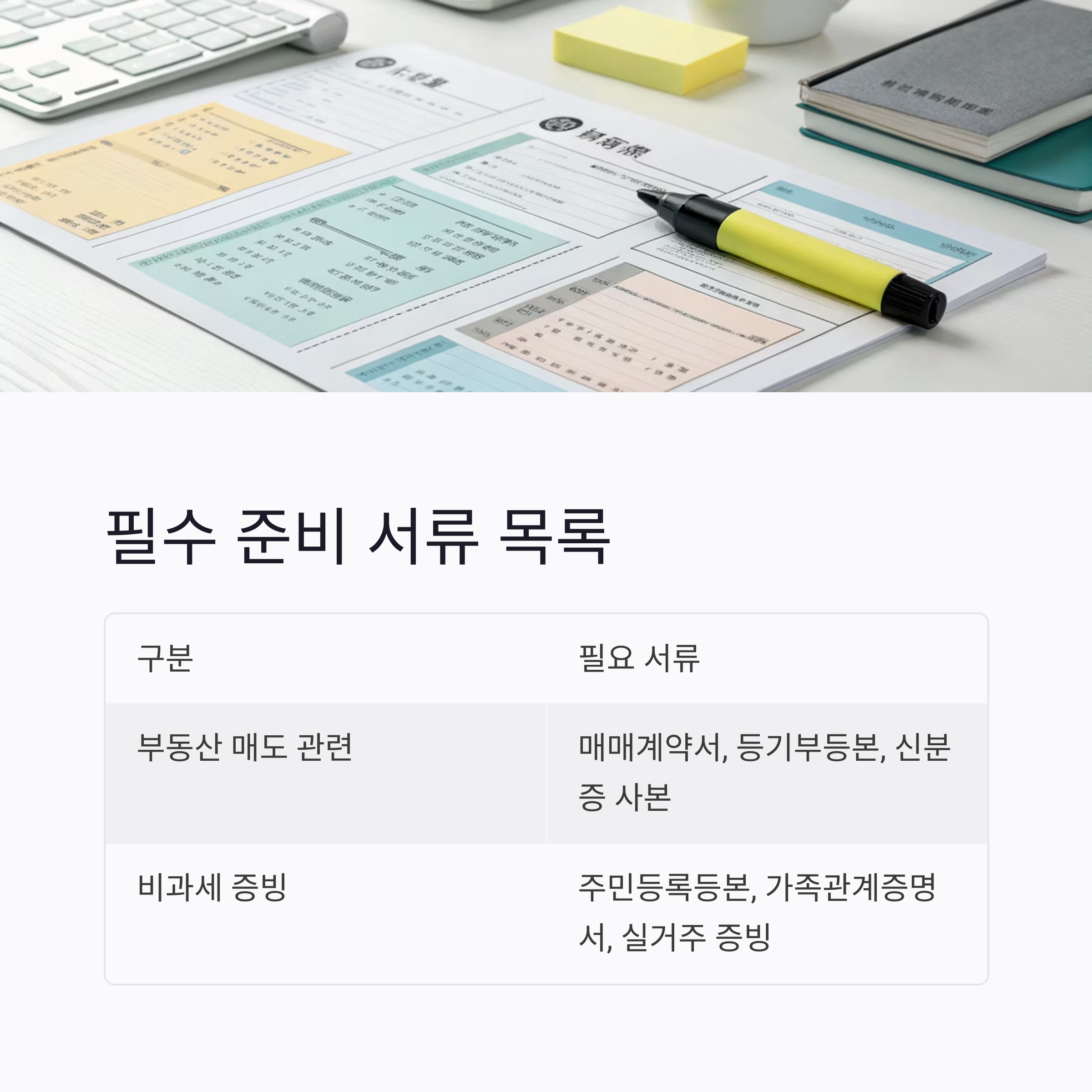 | 부동산 매도 관련 | 매매계약서, 등기부등본, 신분증 사본 |
