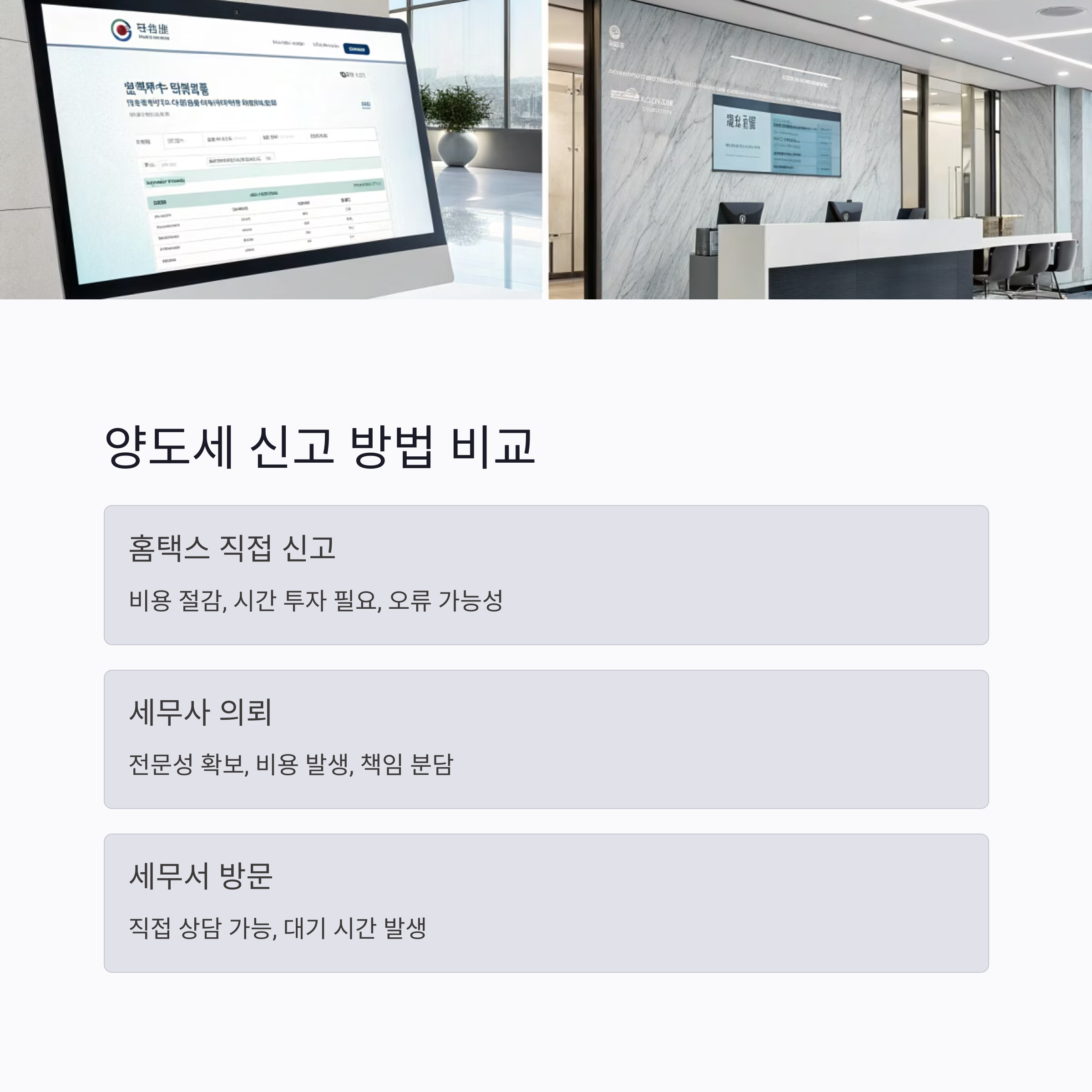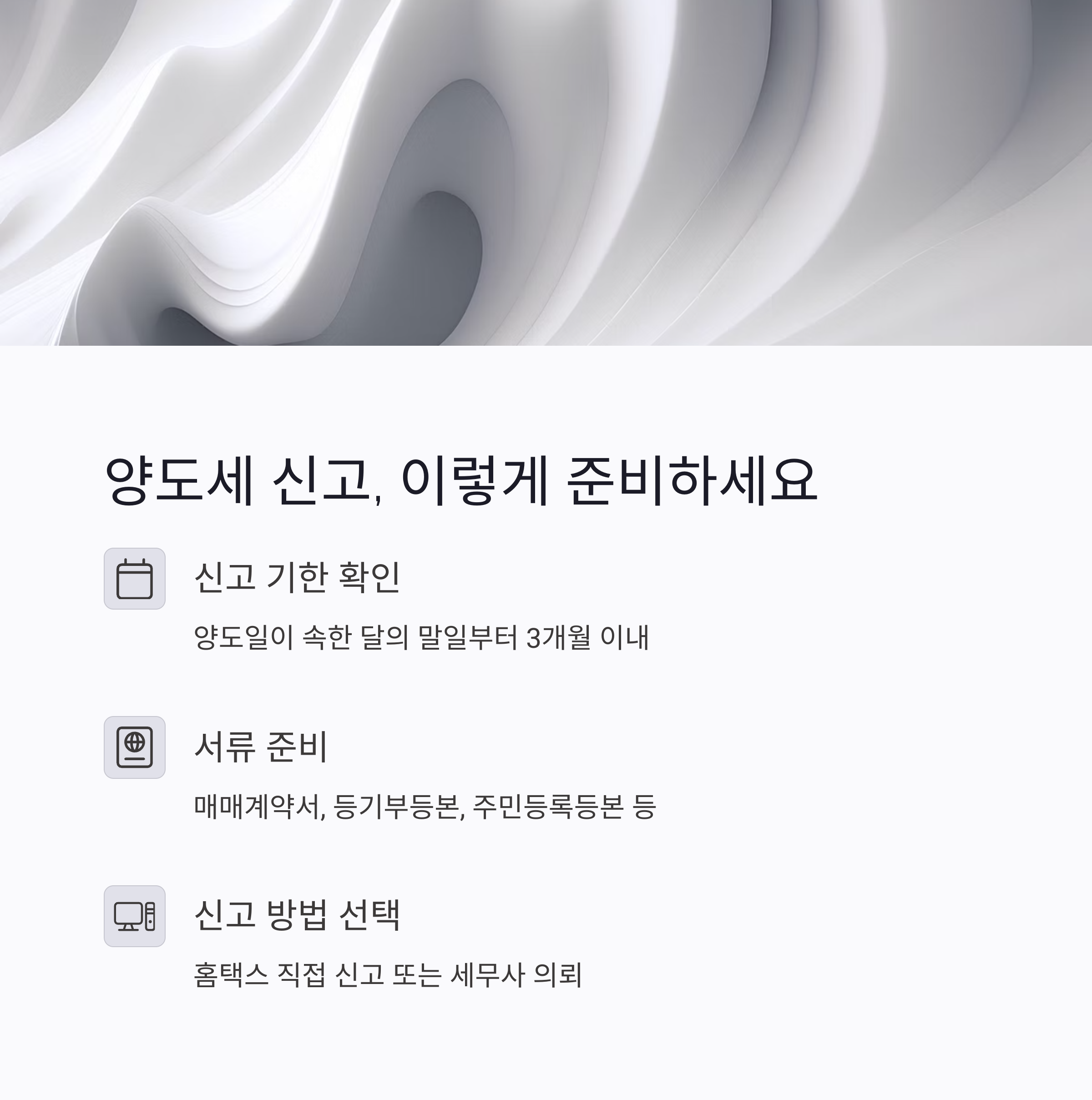 양도세 신고는 국세청 홈택스를 통해 직접 하거나 세무사에게 의뢰할 수 있어요. 중요한 건 신고 기한 내에 정확하게 제출하는 거죠. 아래는 기본적으로 준비해야 할 서류 목록입니다.