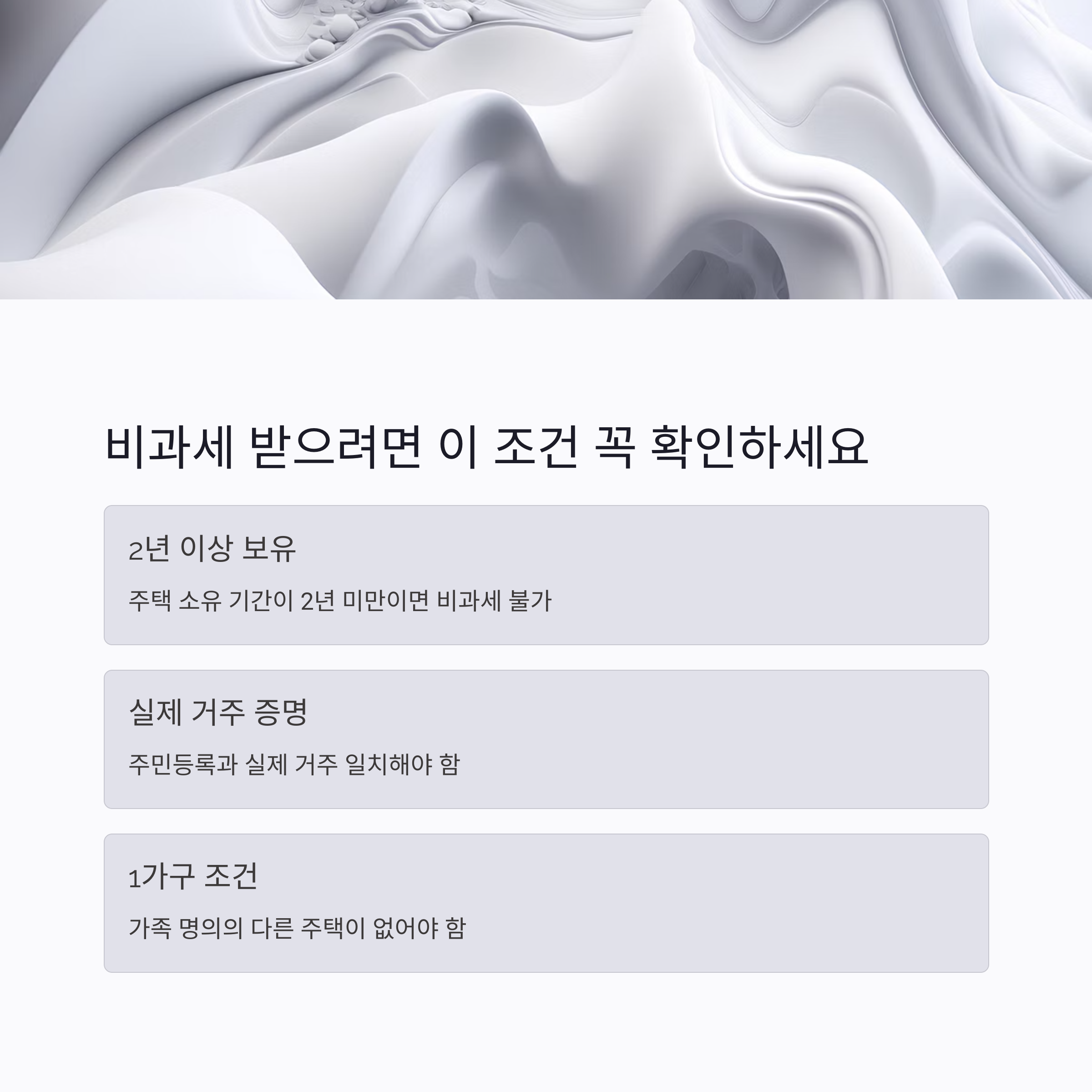 1가구 1주택이라도 양도세가 무조건 면제되는 건 아닙니다. 비과세를 받기 위해선 몇 가지 필수 조건을 만족해야 하죠. 대표적으로는 해당 주택을 2년 이상 보유하고 실거주했어야 해요. 또 최근에는 조정대상지역 여부나 일시적 2주택 등의 예외 상황도 따져봐야 하니 단순히 ‘한 채만 있어요’라고 끝낼 수 없는 문제죠. 꼼꼼하게 조건을 체크해야 세금 폭탄을 피할 수 있습니다.