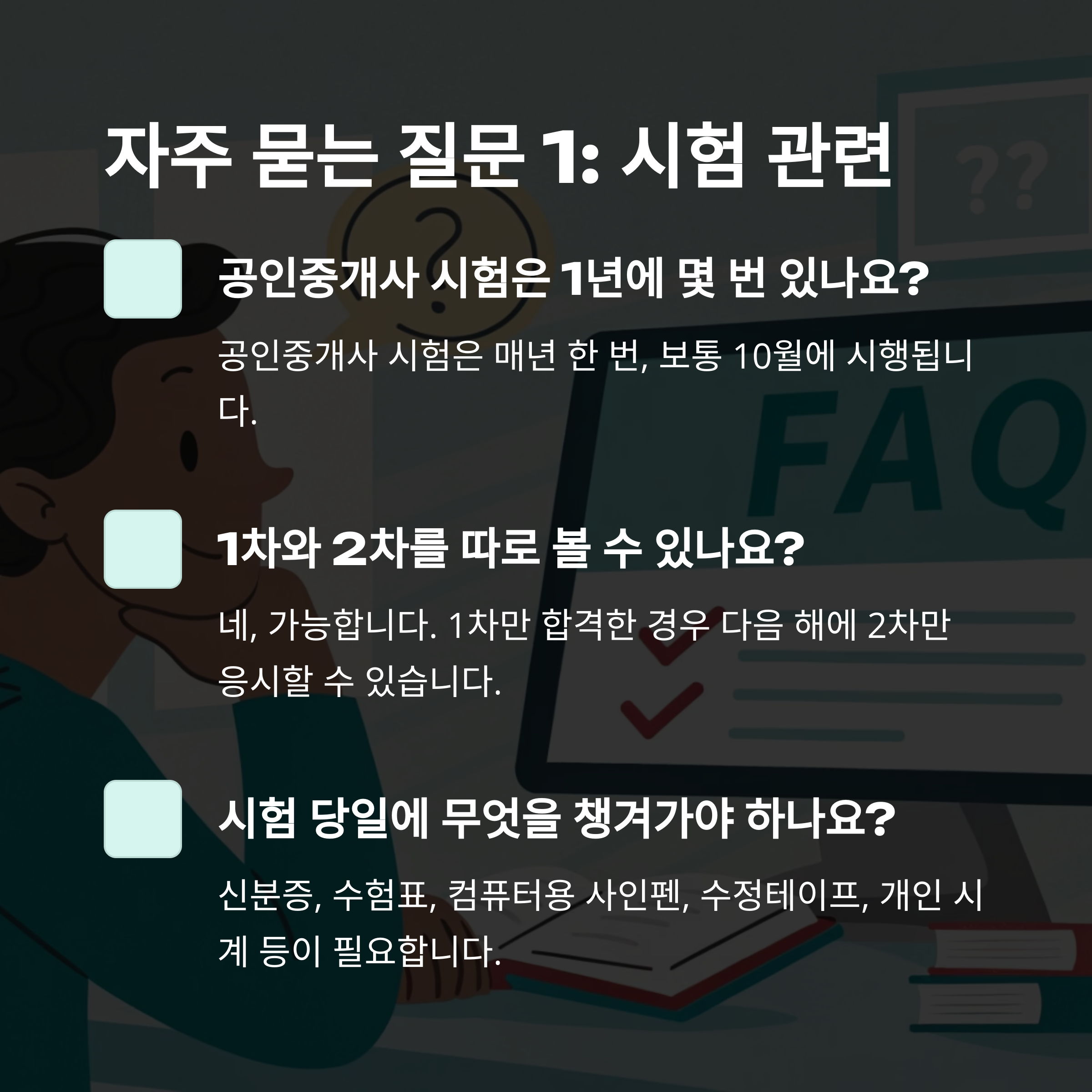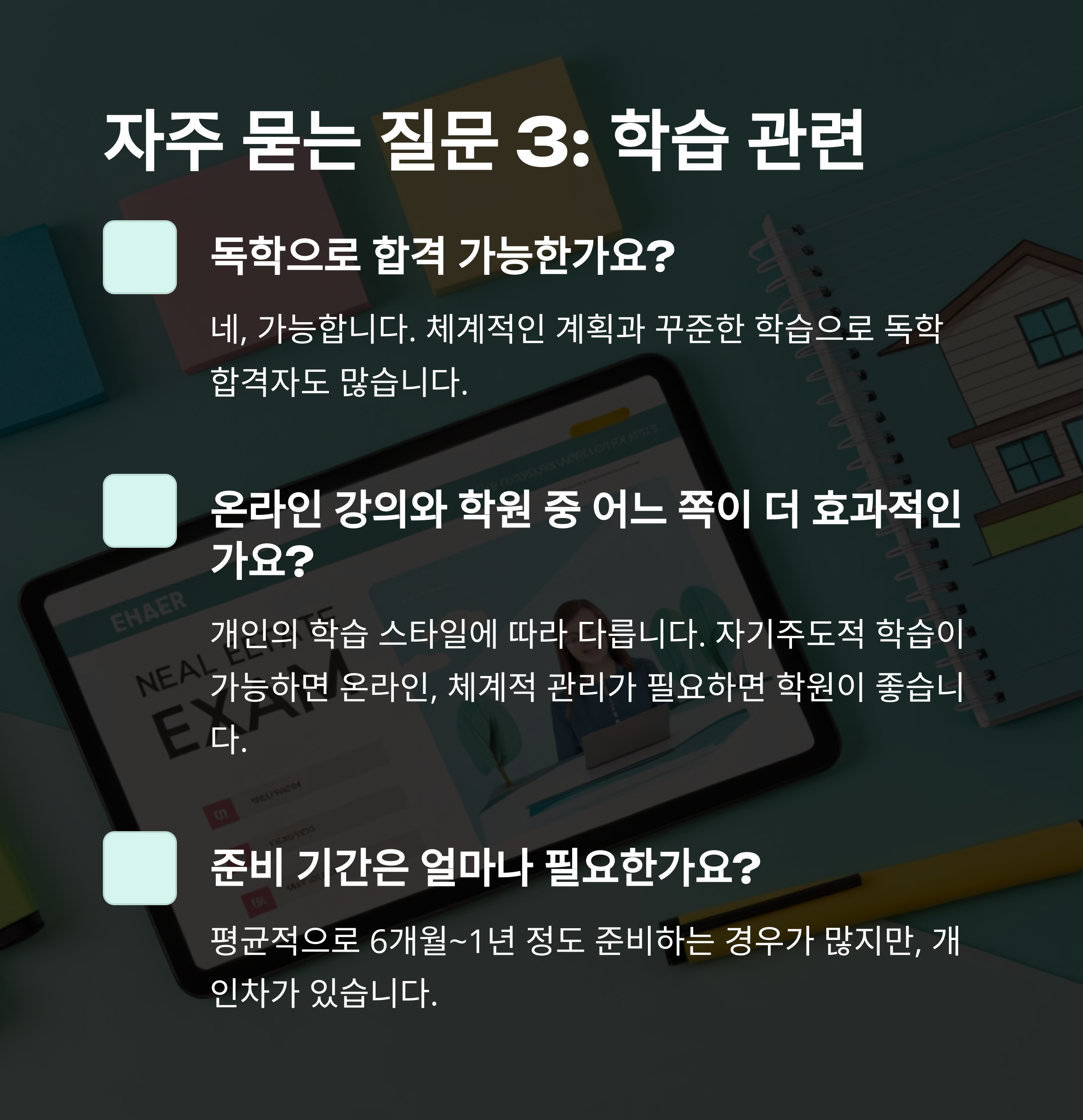 이제까지의 정보를 바탕으로 수험생들이 자주 묻는 질문을 정리해보았습니다. 혼자서도 충분히 준비할 수 있지만, 때로는 방향 설정이 필요할 수 있으니 꼼꼼히 확인해 보세요.