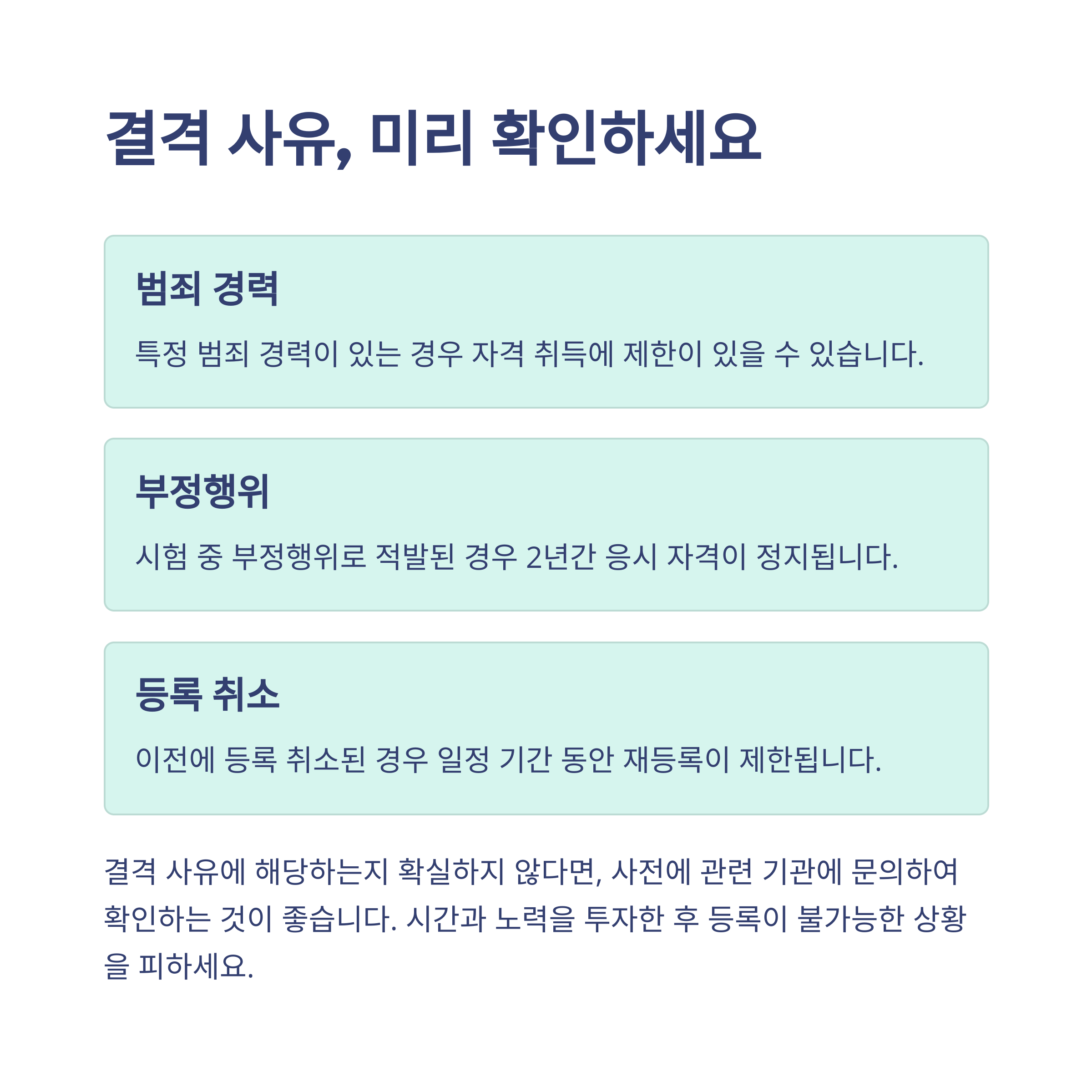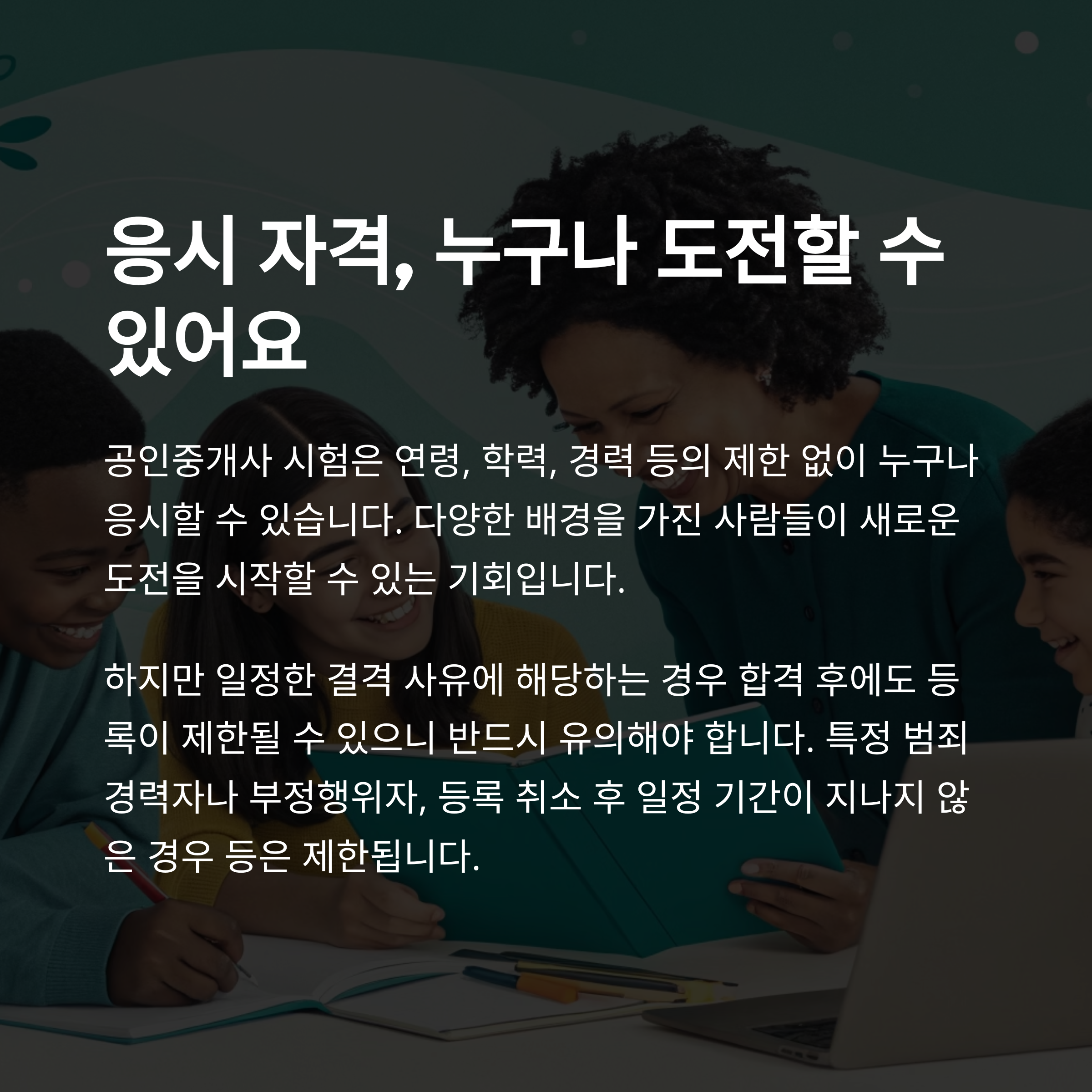 공인중개사 시험은 연령, 학력, 경력 등의 제한 없이 누구나 응시할 수 있습니다. 하지만 일정한 결격 사유에 해당하는 경우 합격 후에도 등록이 제한될 수 있으니 반드시 유의해야 합니다. 예를 들어, 특정 범죄 경력자나 부정행위자, 등록 취소 후 일정 기간이 지나지 않은 경우 등은 제한됩니다.