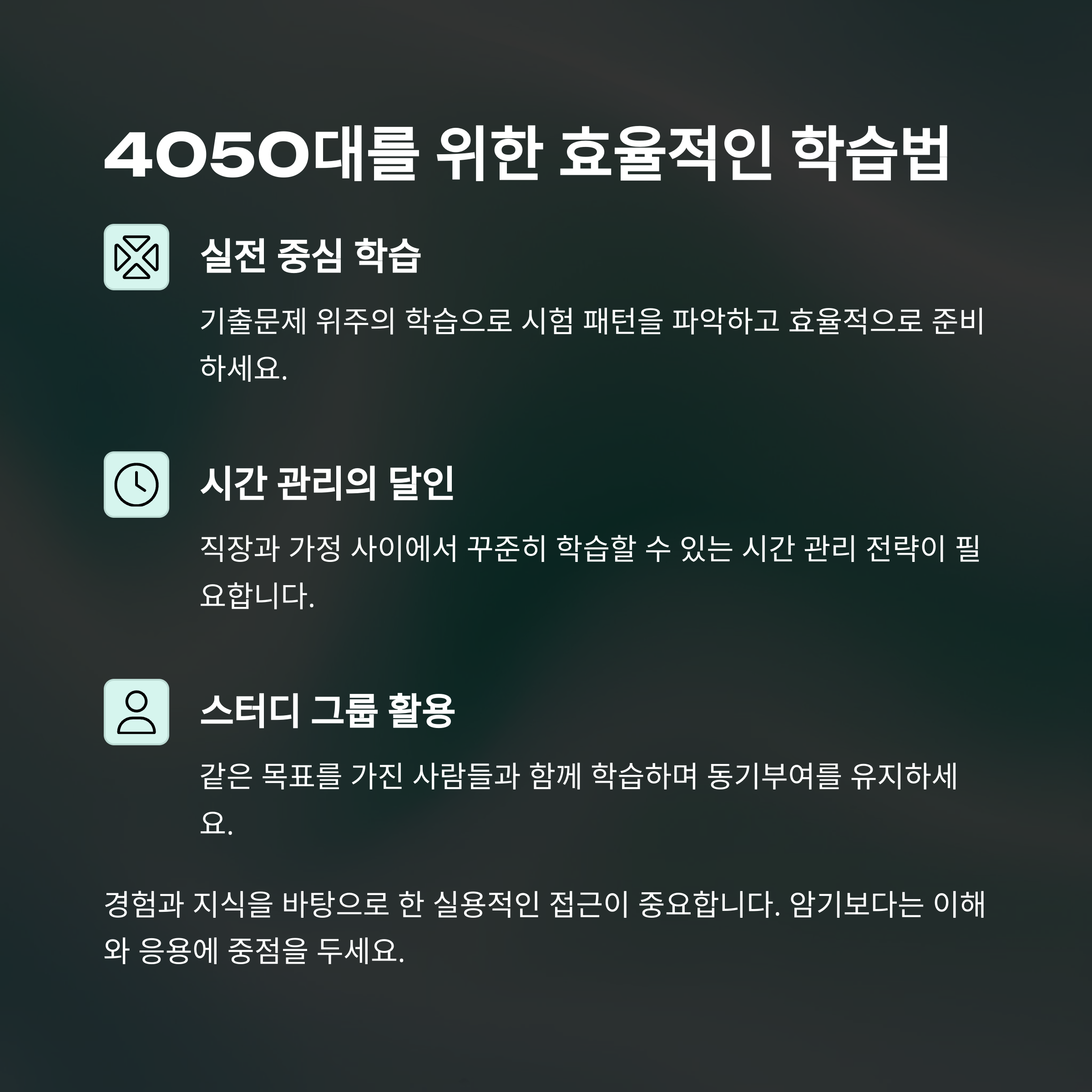 | 40~50대 | 실전 중심, 기출문제 위주 학습 |