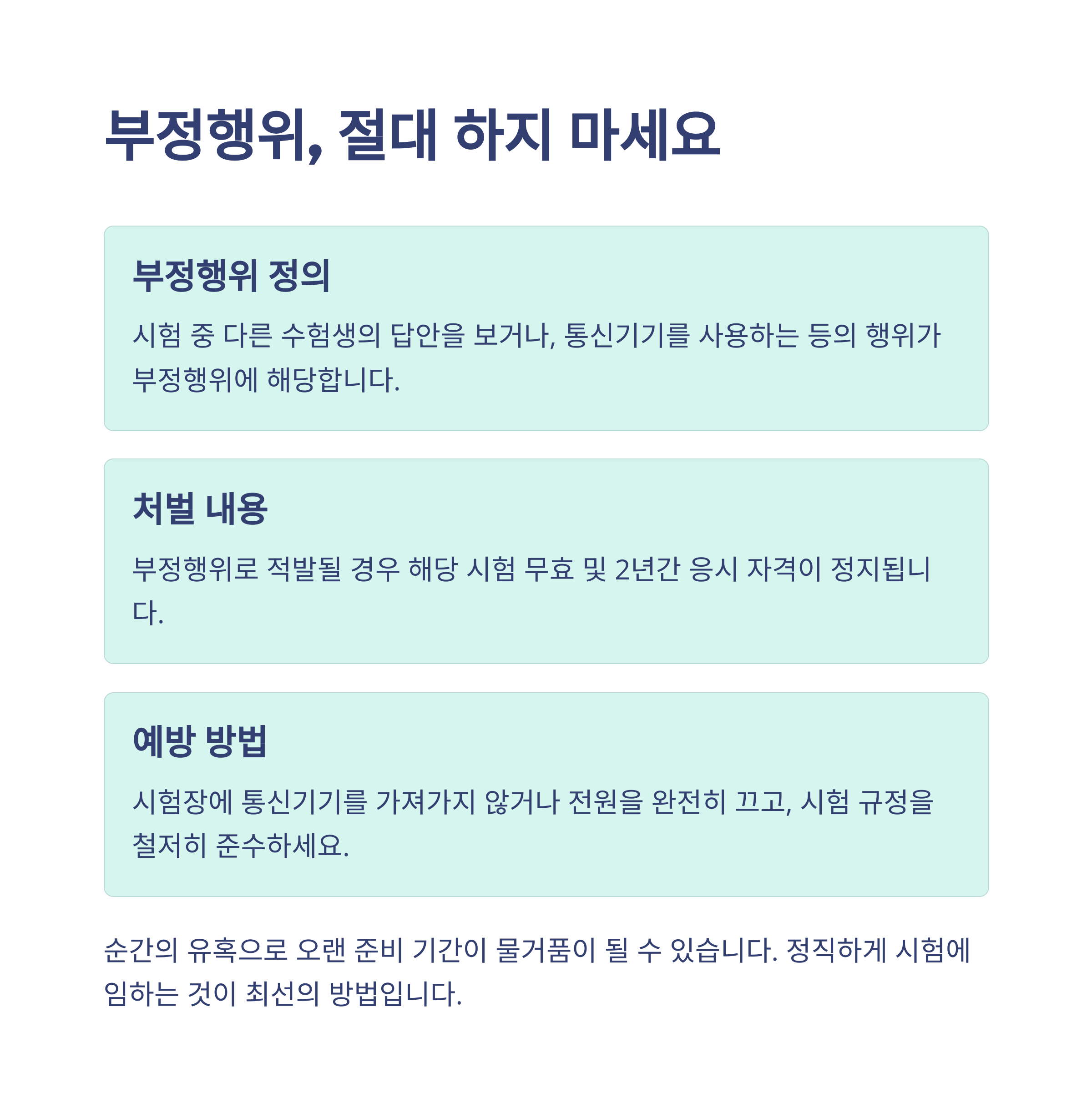 부정행위로 적발될 경우 해당 시험 무효 및 2년간 응시 자격이 정지됩니다.