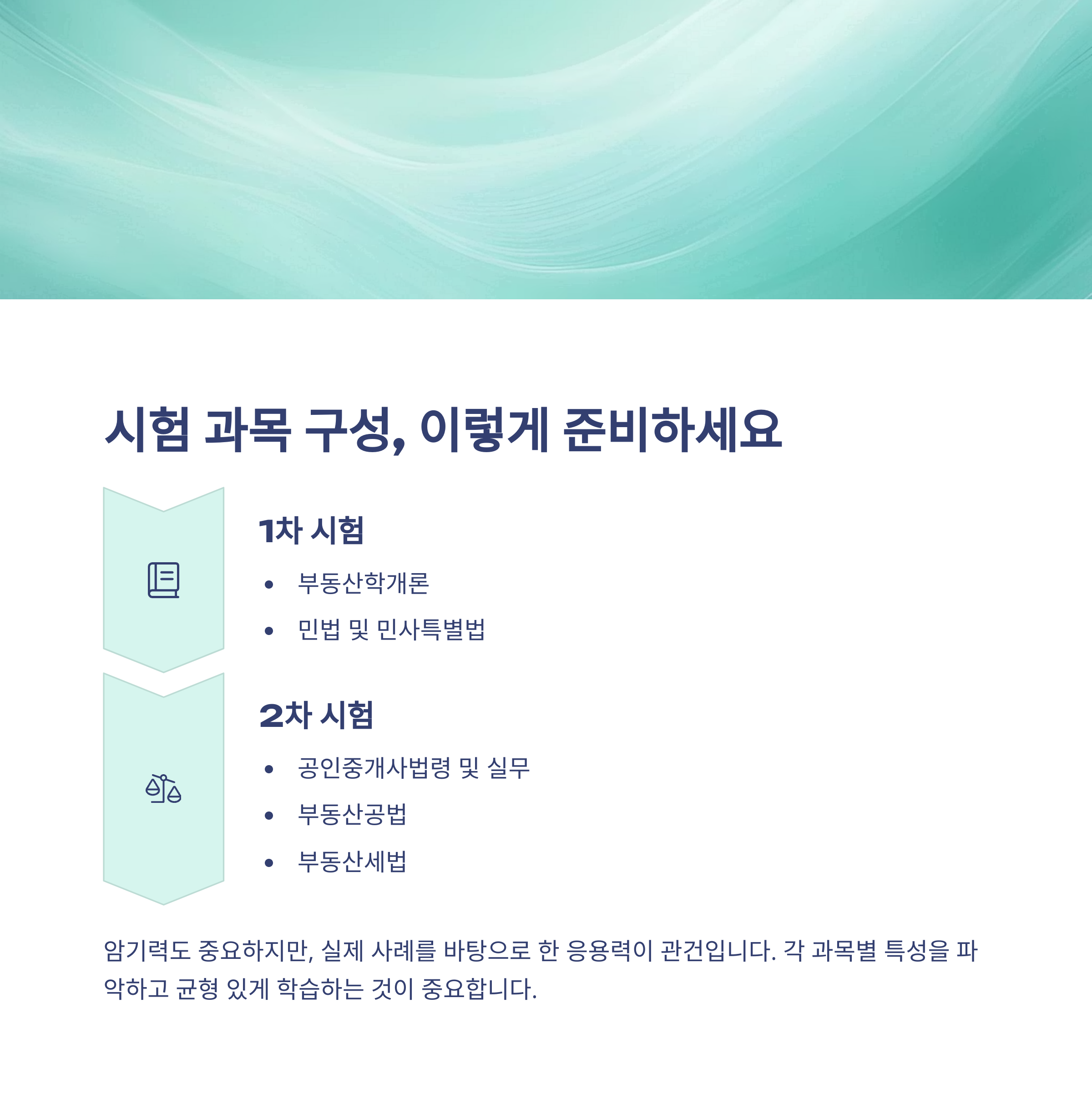 - 2차: 공인중개사법령 및 실무, 부동산공법, 부동산세법