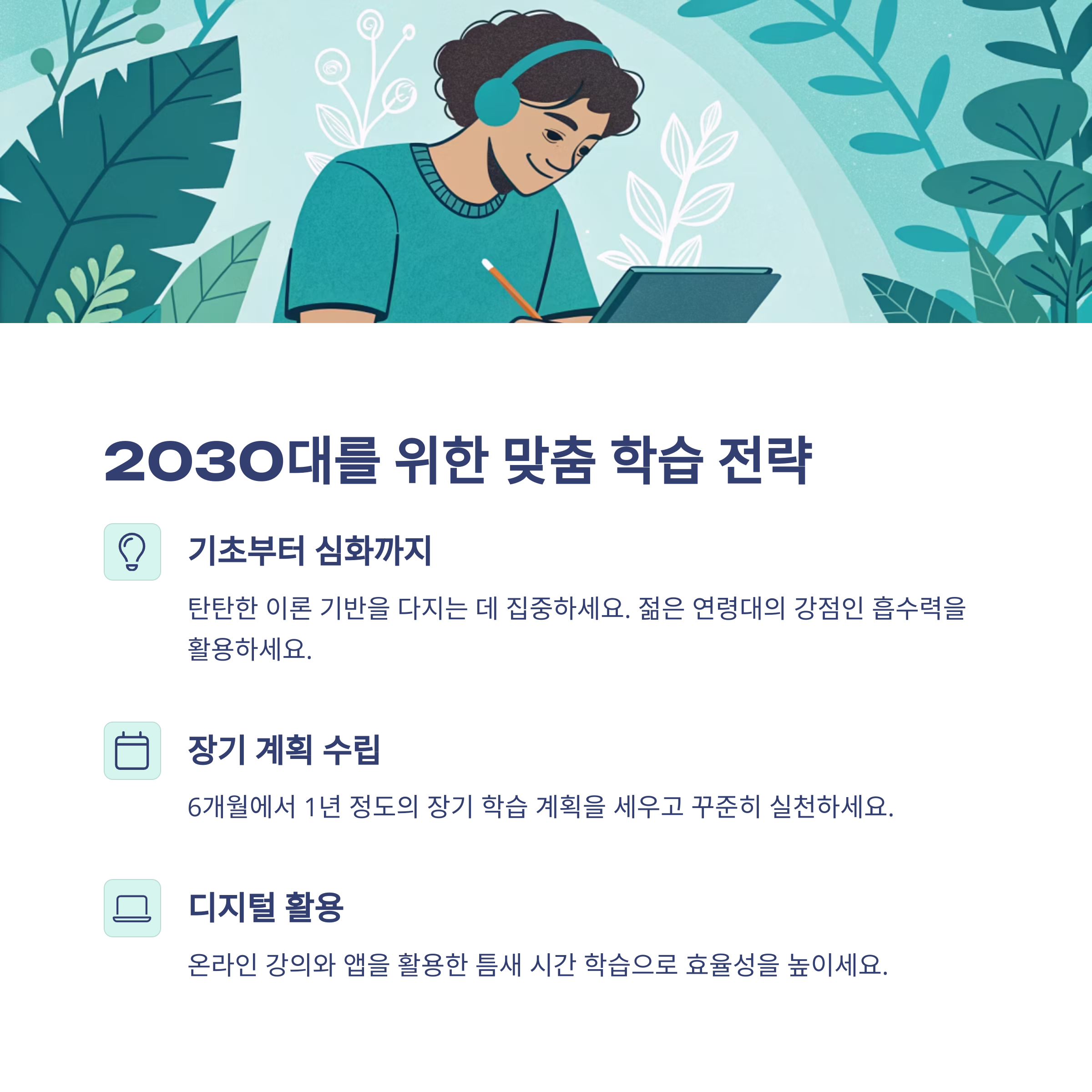 | 60대 이상 | 중요 개념 위주 요약 반복 |