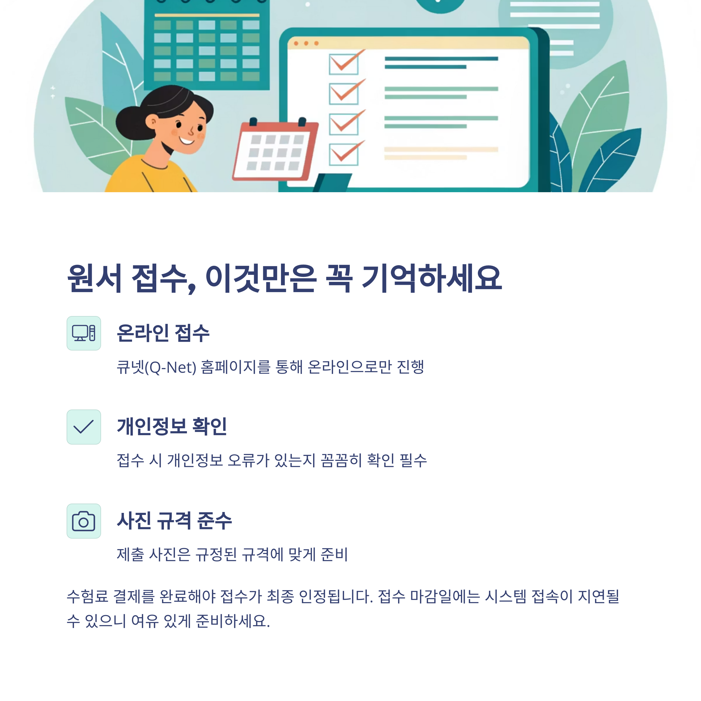 공인중개사 시험 원서접수는 큐넷(Q-Net) 홈페이지를 통해 온라인으로 진행됩니다. 접수 시 개인정보 오류가 있는지 꼭 확인해야 하며, 사진 규격 등 세부 요건도 놓치지 말아야 합니다. 또한 수험료 결제를 완료해야 접수가 인정됩니다.