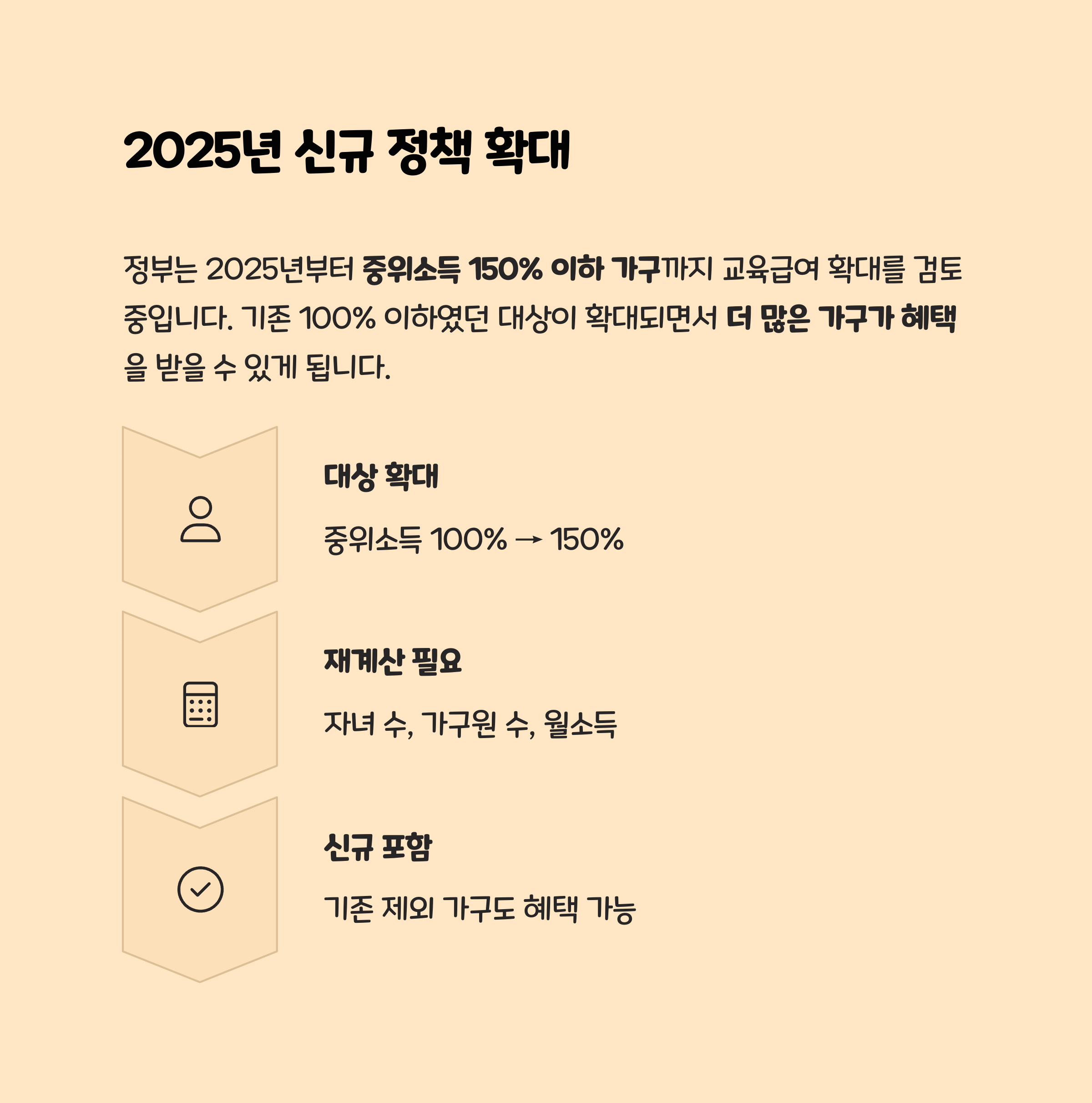 정부는 2025년부터 중위소득 150% 이하 가구까지 교육급여 확대를 검토 중입니다.