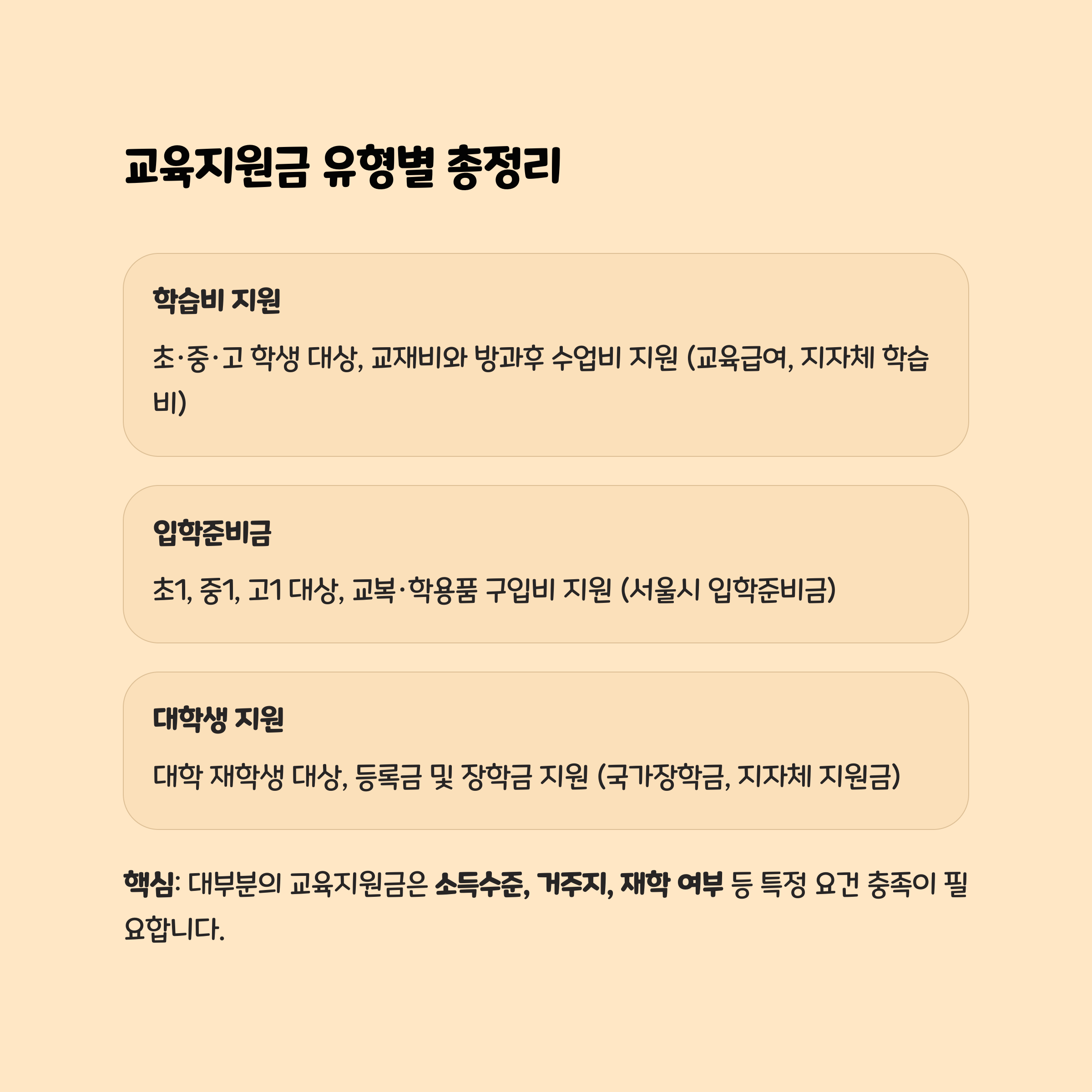 핵심: 대부분의 교육지원금은 소득수준, 거주지, 재학 여부 등 특정 요건 충족이 필요합니다.