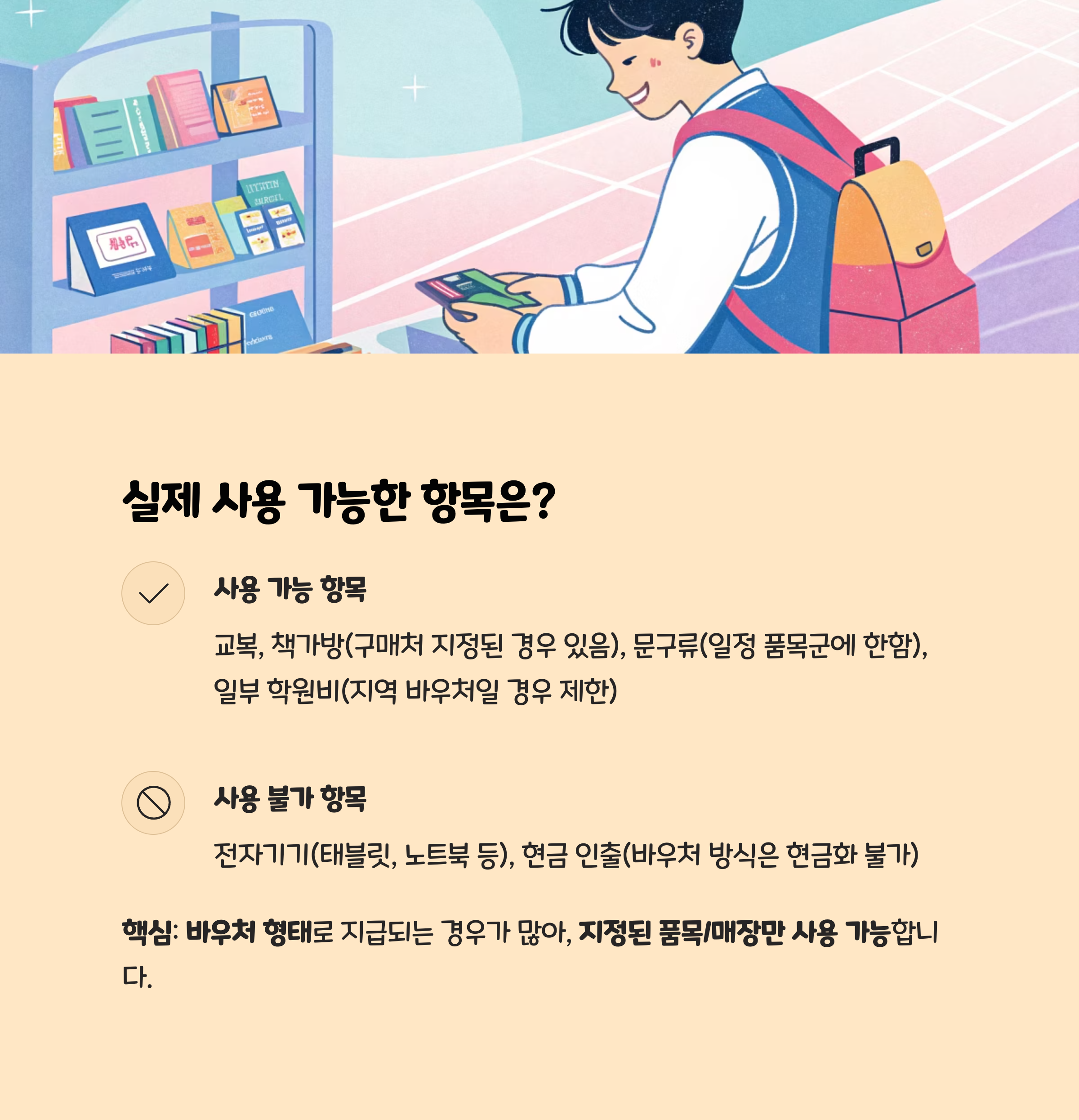 핵심: 바우처 형태로 지급되는 경우가 많아, 지정된 품목/매장만 사용 가능합니다.