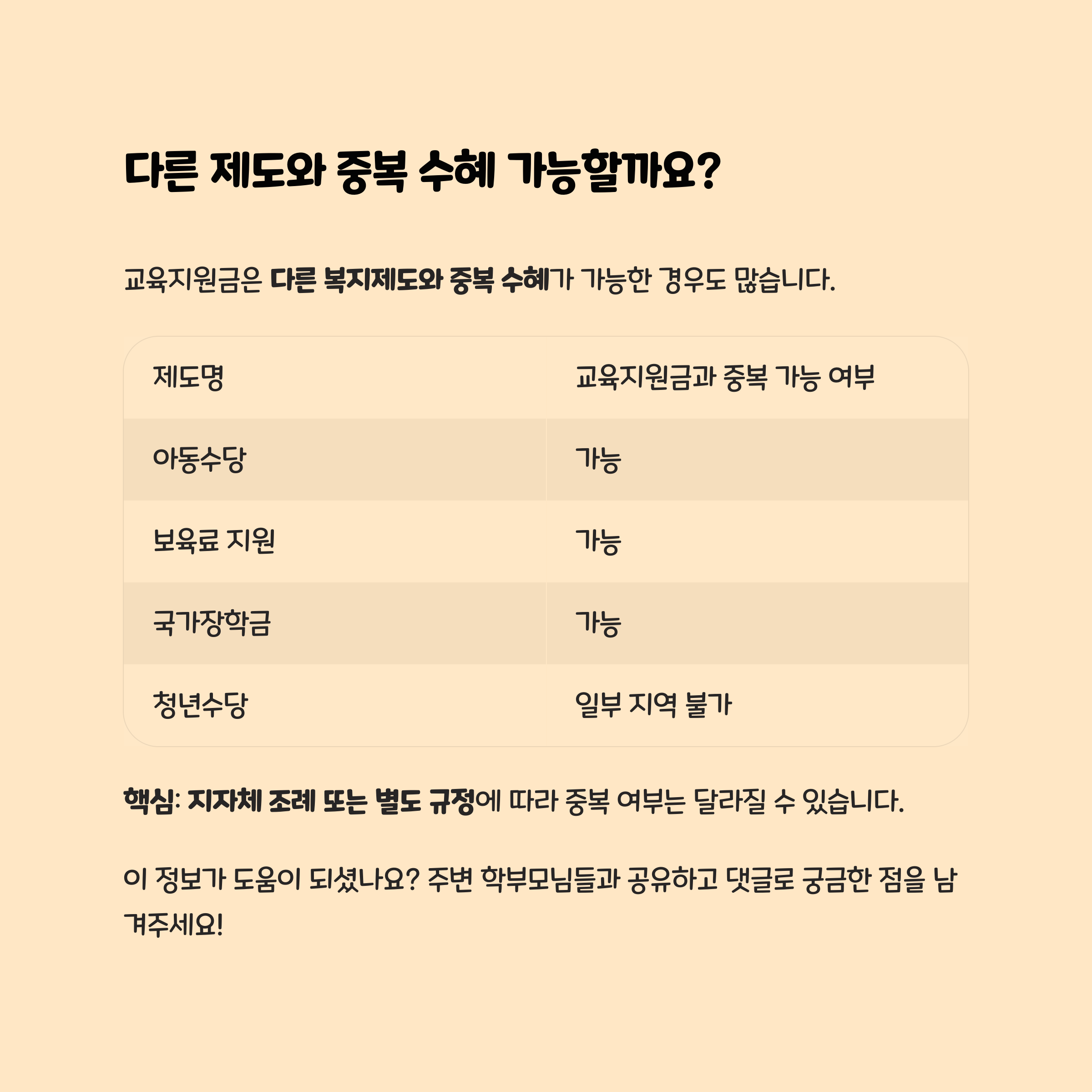 | 제도명 | 교육지원금과 중복 가능 여부 |