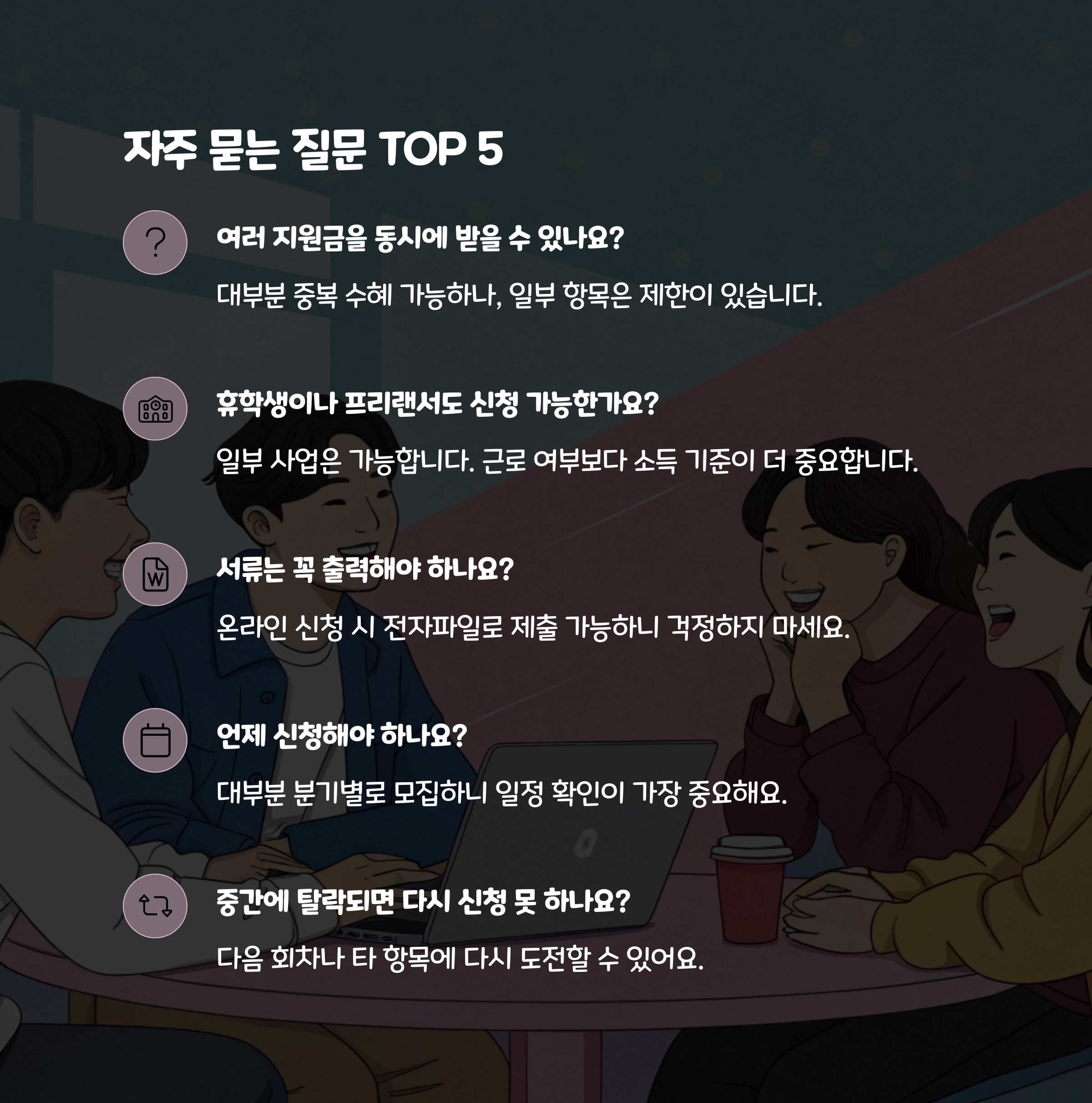 A. 대부분 중복 수혜 가능하나, 일부 항목은 제한이 있습니다. - Q. 휴학생이나 프리랜서도 신청 가능한가요?