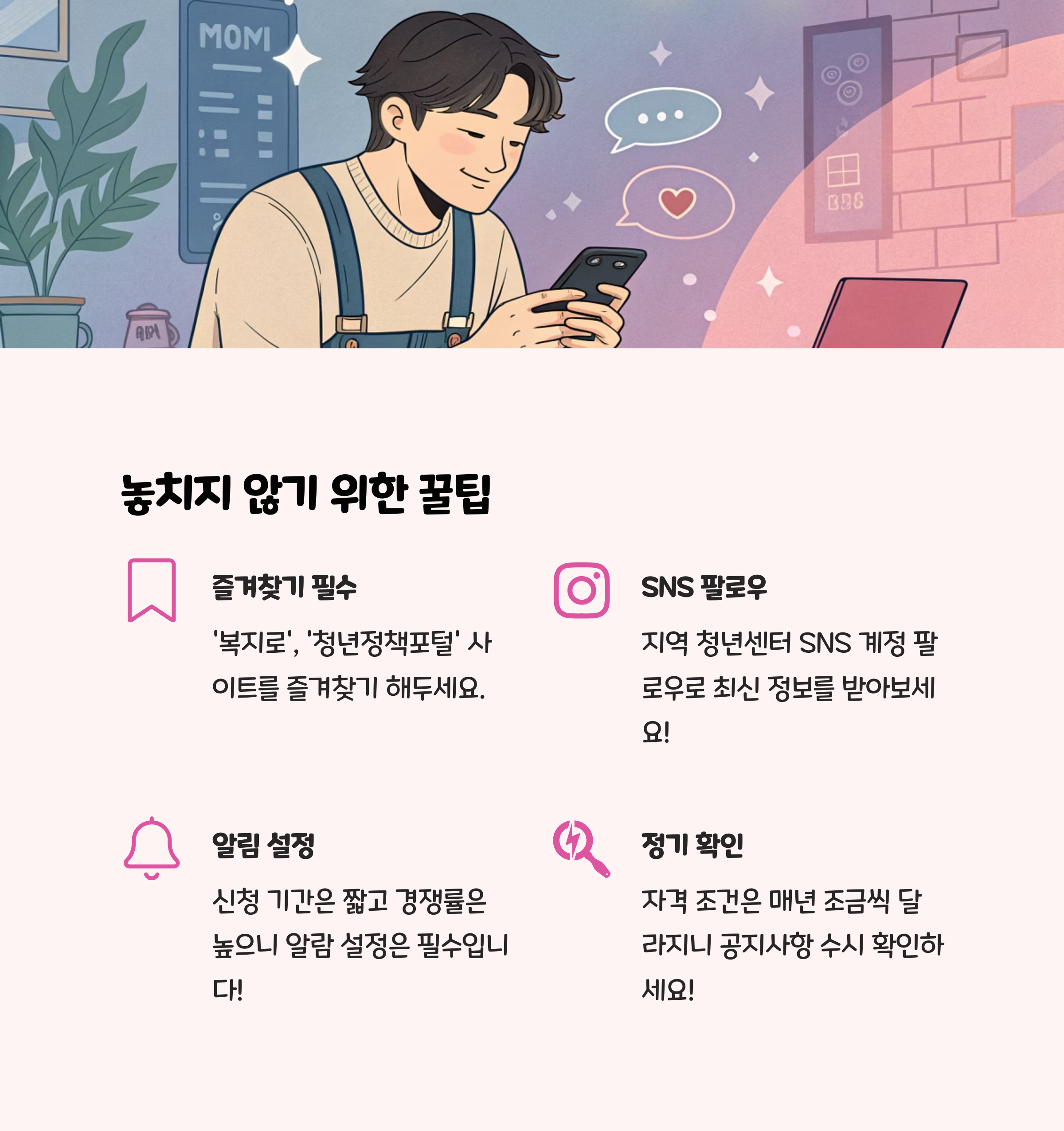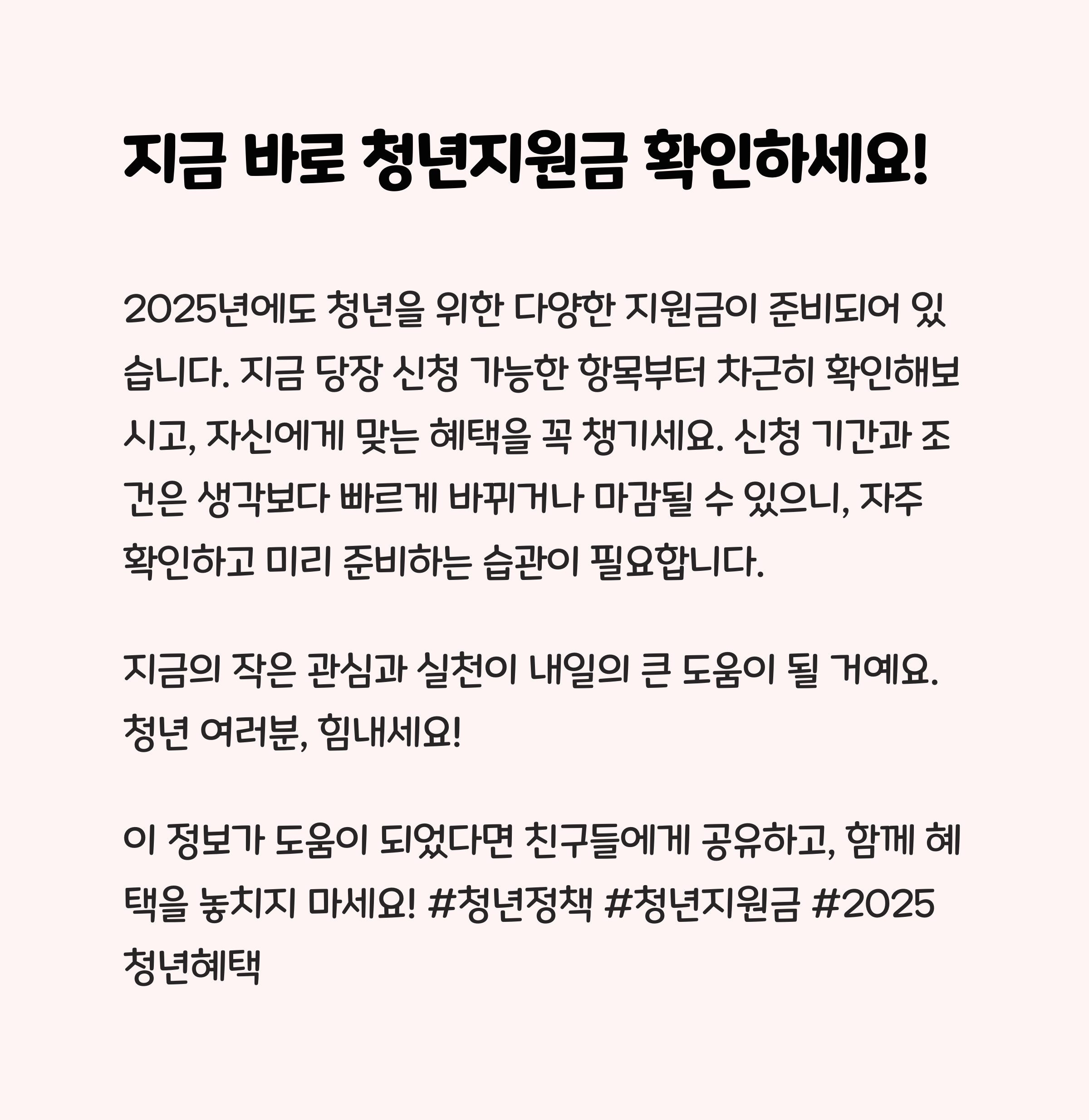 2025년에도 청년을 위한 다양한 지원금이 준비되어 있습니다. 지금 당장 신청 가능한 항목부터 차근히 확인해보시고, 자신에게 맞는 혜택을 꼭 챙기세요. 신청 기간과 조건은 생각보다 빠르게 바뀌거나 마감될 수 있으니, 자주 확인하고 미리 준비하는 습관이 필요합니다. 지금의 작은 관심과 실천이 내일의 큰 도움이 될 거예요. 청년 여러분, 힘내세요!