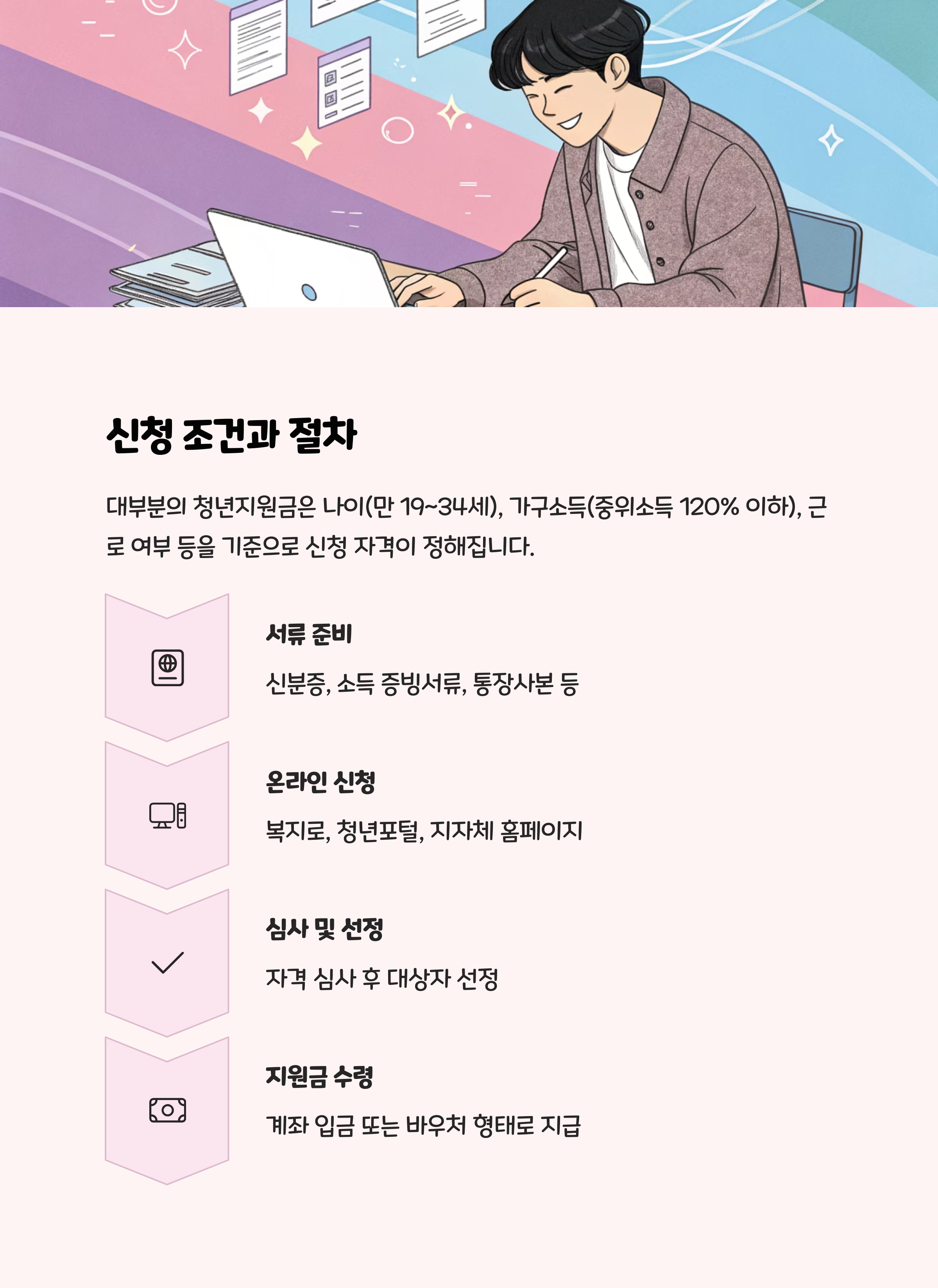 대부분의 청년지원금은 나이(만 19~34세), 가구소득(중위소득 120% 이하), 근로 여부 등을 기준으로 신청 자격이 정해집니다. 신청은 보통 복지로, 청년포털, 각 지자체 홈페이지를 통해 온라인으로 진행되며, 신분증, 소득 증빙서류, 통장사본 등이 필요합니다.