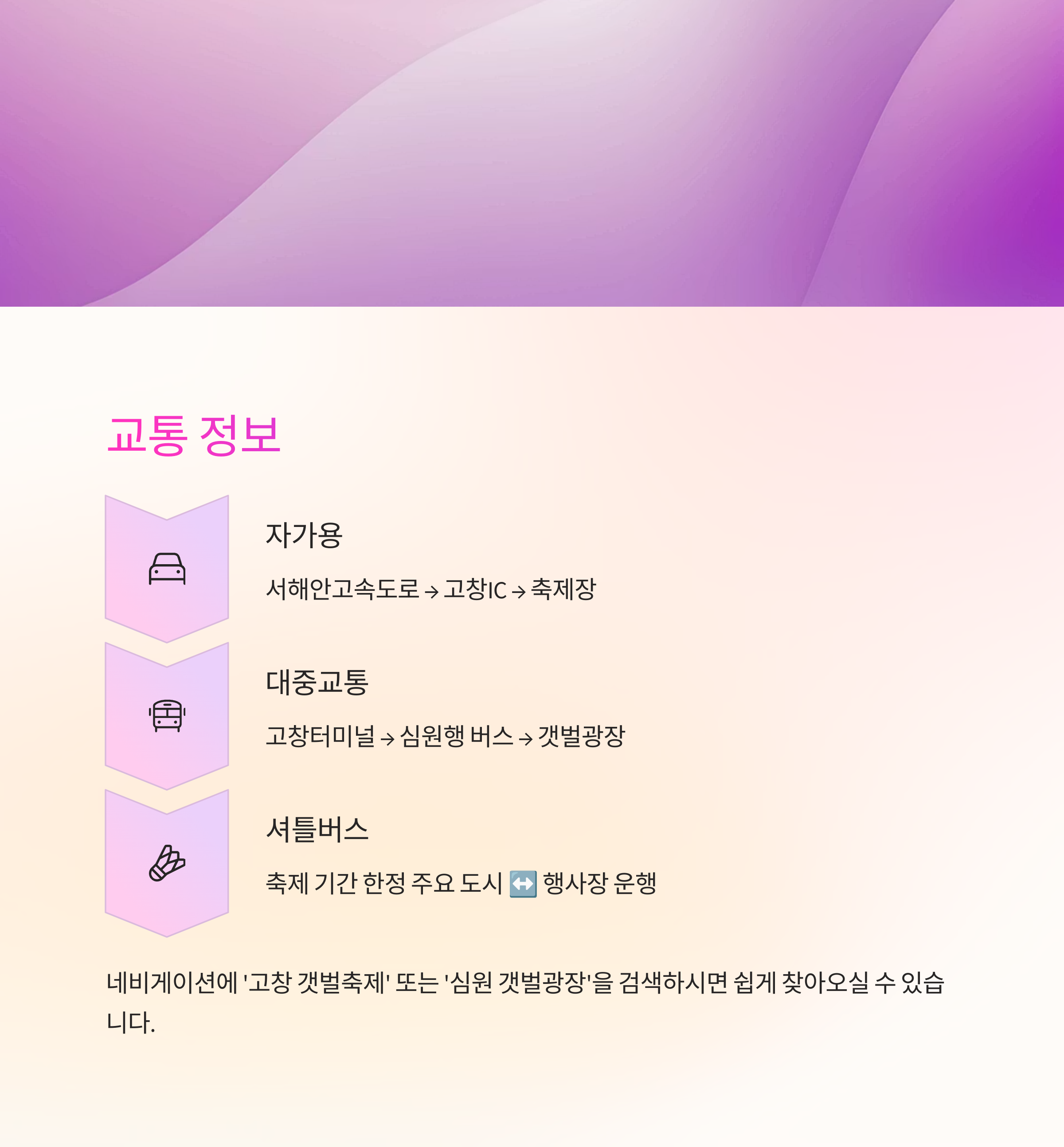 - 셔틀버스: 축제 기간 한정 주요 도시 ↔ 행사장 운행