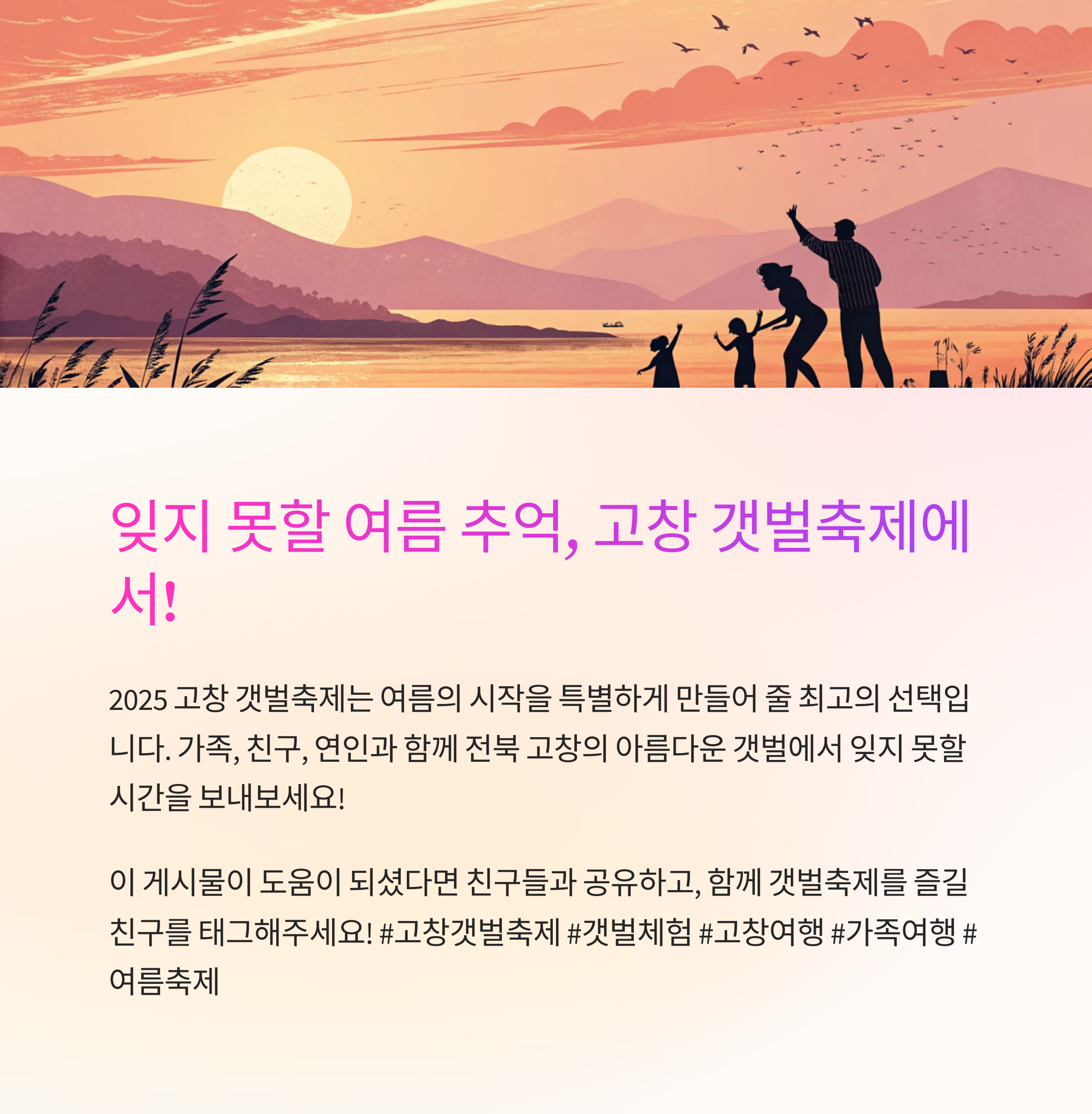 2025 고창 갯벌축제는 여름의 시작을 특별하게 만들어 줄 최고의 선택입니다. 가족, 친구, 연인과 함께 전북 고창의 아름다운 갯벌에서 잊지 못할 시간을 보내보세요!