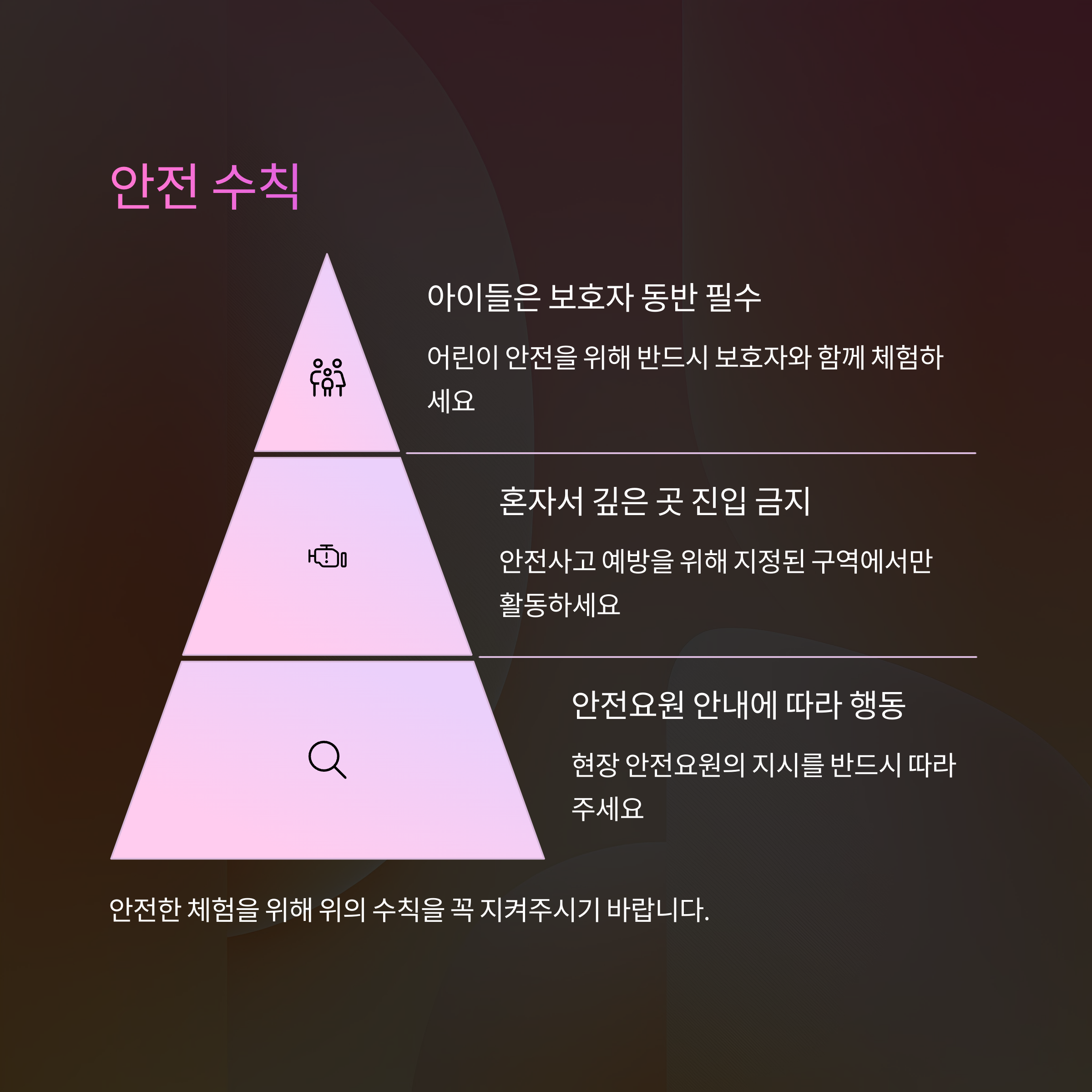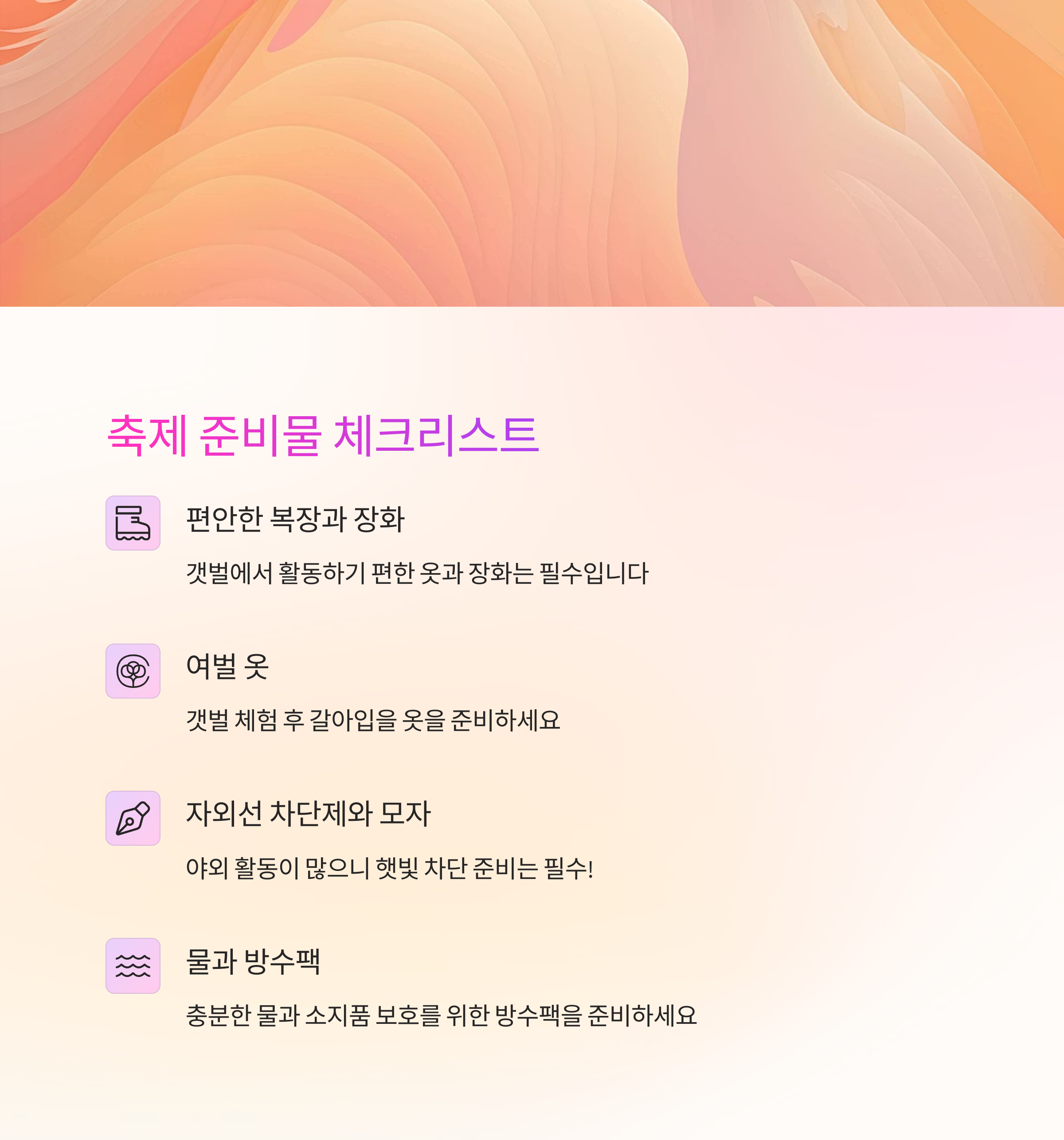 장화, 여벌 옷, 모자, 선크림, 방수팩 등은 필수! 갯벌 체험 시 진흙으로 더러워질 수 있으니 대비하세요.