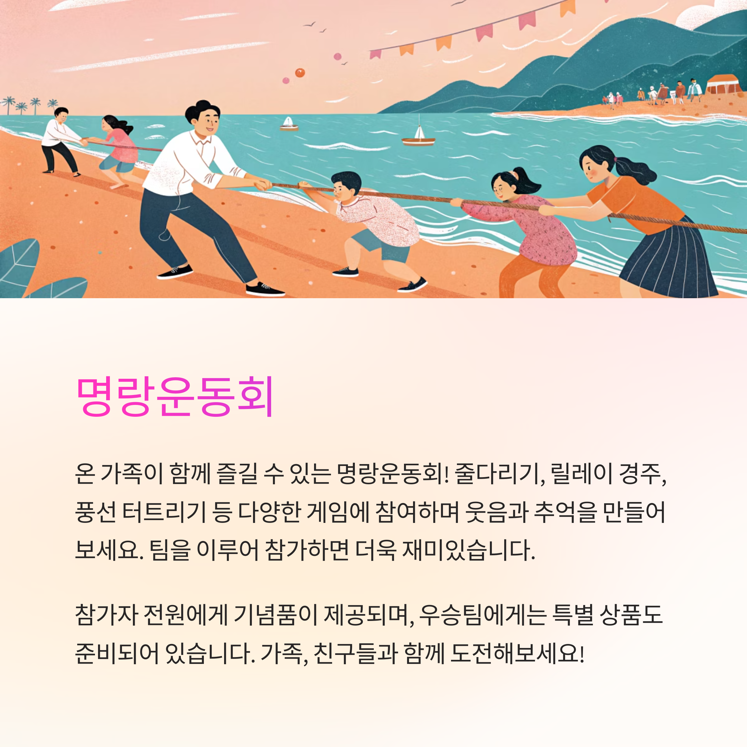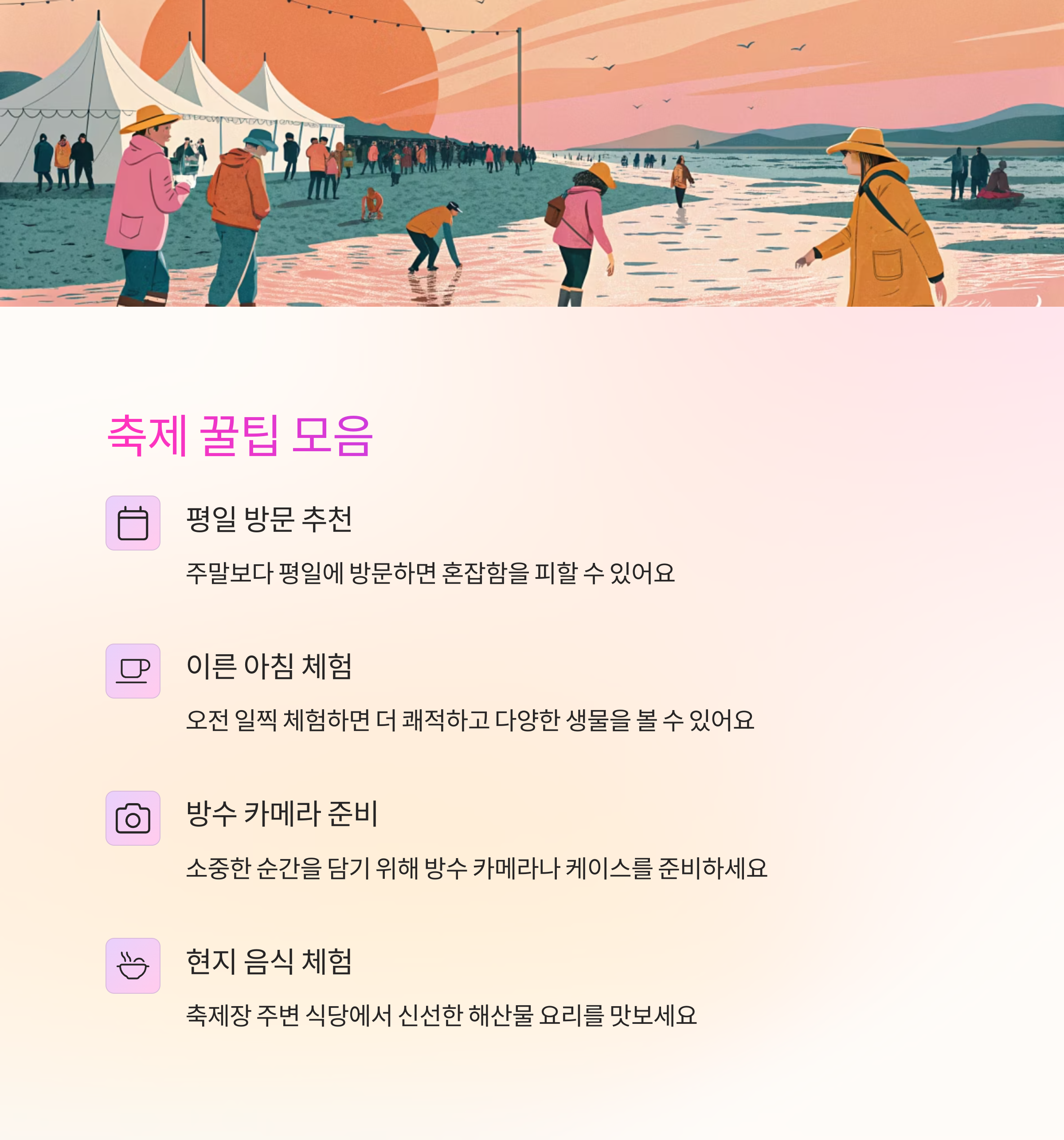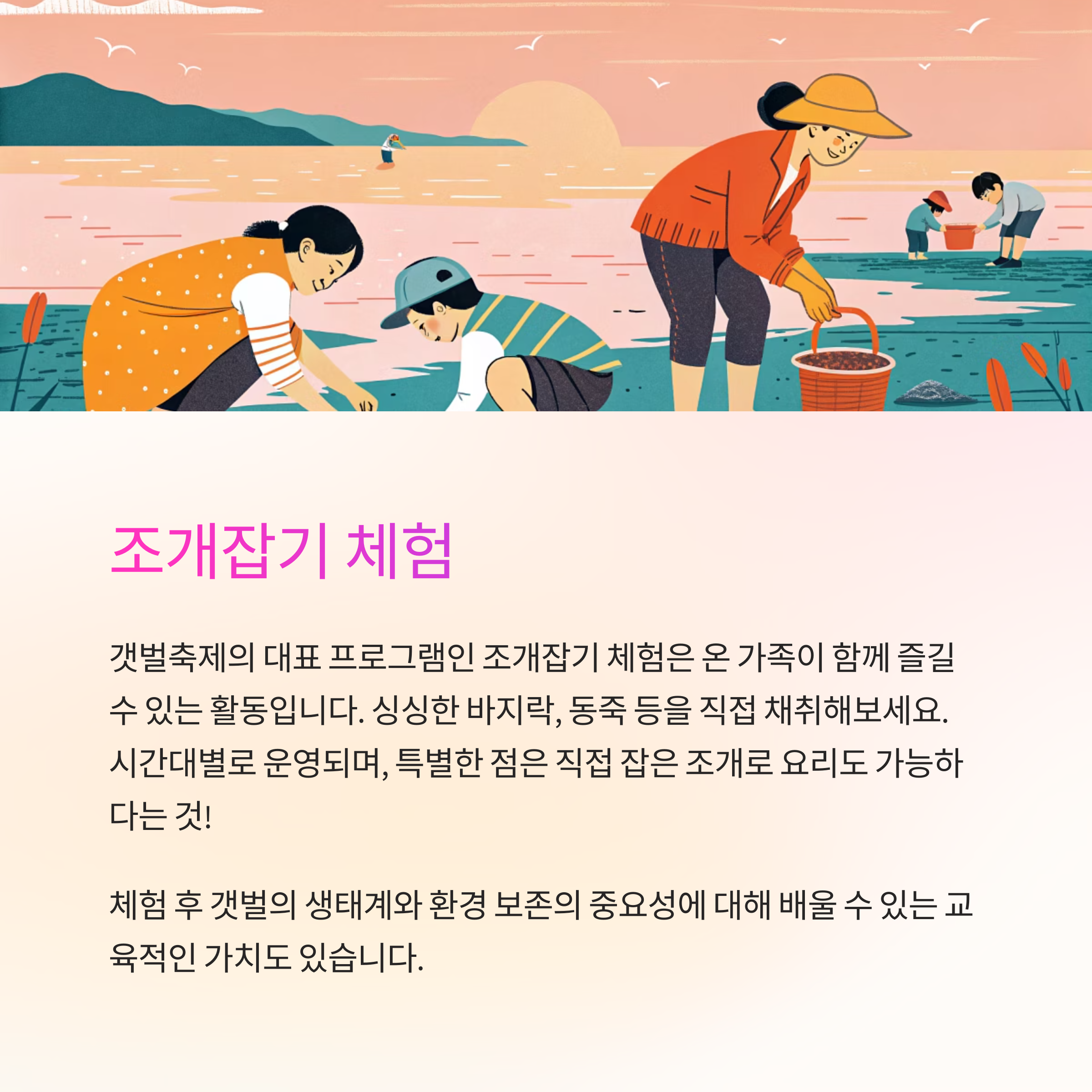 조개잡기, 풍천장어 맨손잡기, 갯벌지킴이 걷기, K-POP 댄스 대회, 명랑운동회까지! 시간대별로 운영되니 미리 일정 확인은 필수입니다.