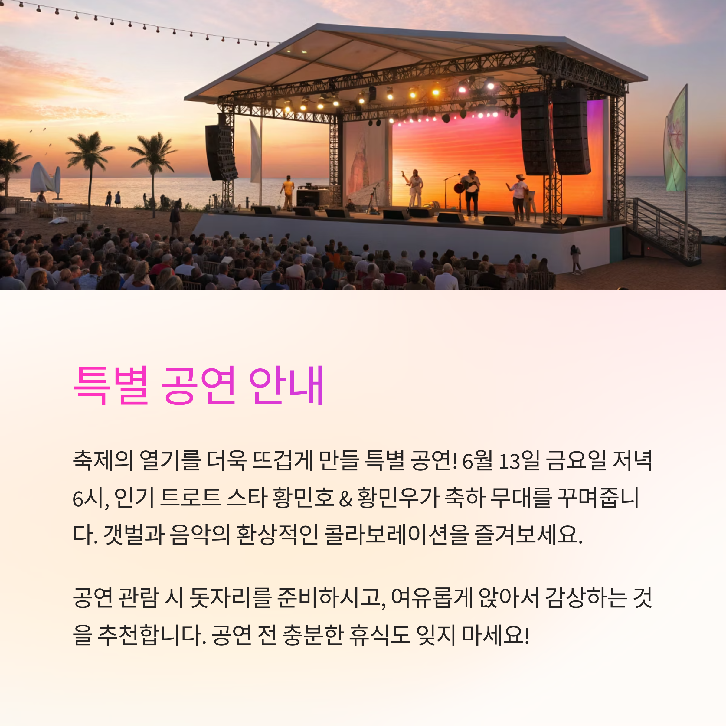 6월 13일 금요일 저녁 6시, 황민호 & 황민우가 축하 무대를 꾸며줍니다. 갯벌과 음악의 환상 콜라보를 즐겨보세요.