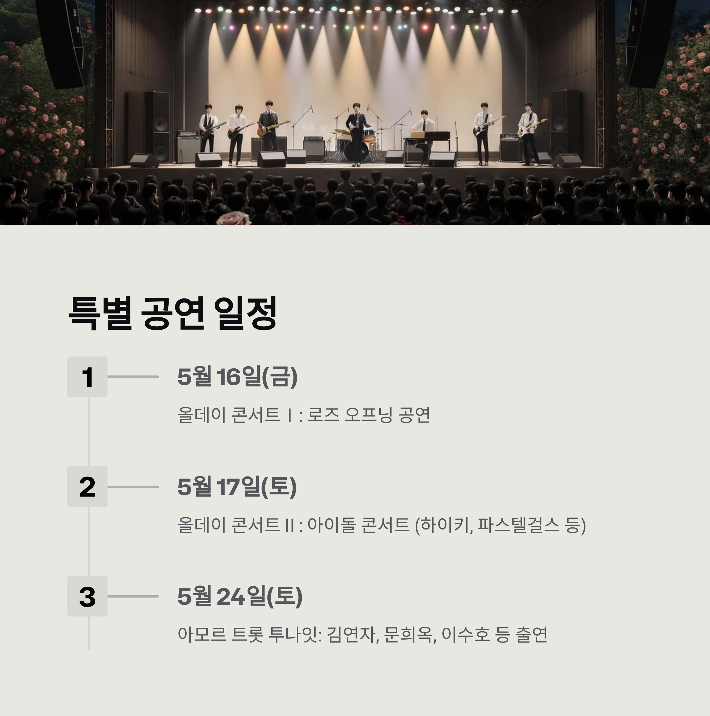 | 5월 16일(금) | 올데이 콘서트Ⅰ: 로즈 오프닝 공연 |