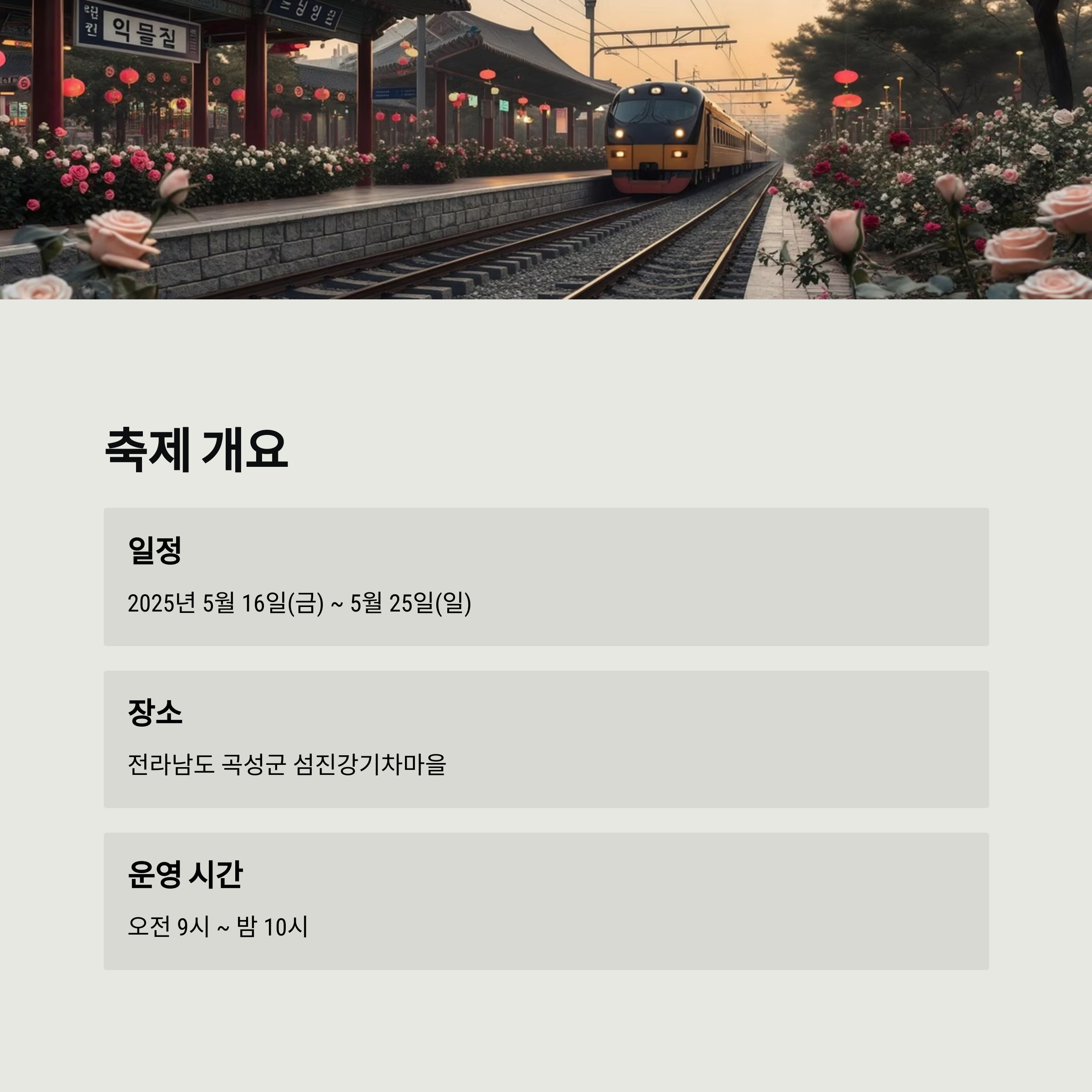 | 장소 | 전라남도 곡성군 오곡면 기차마을로 232 (섬진강기차마을) |