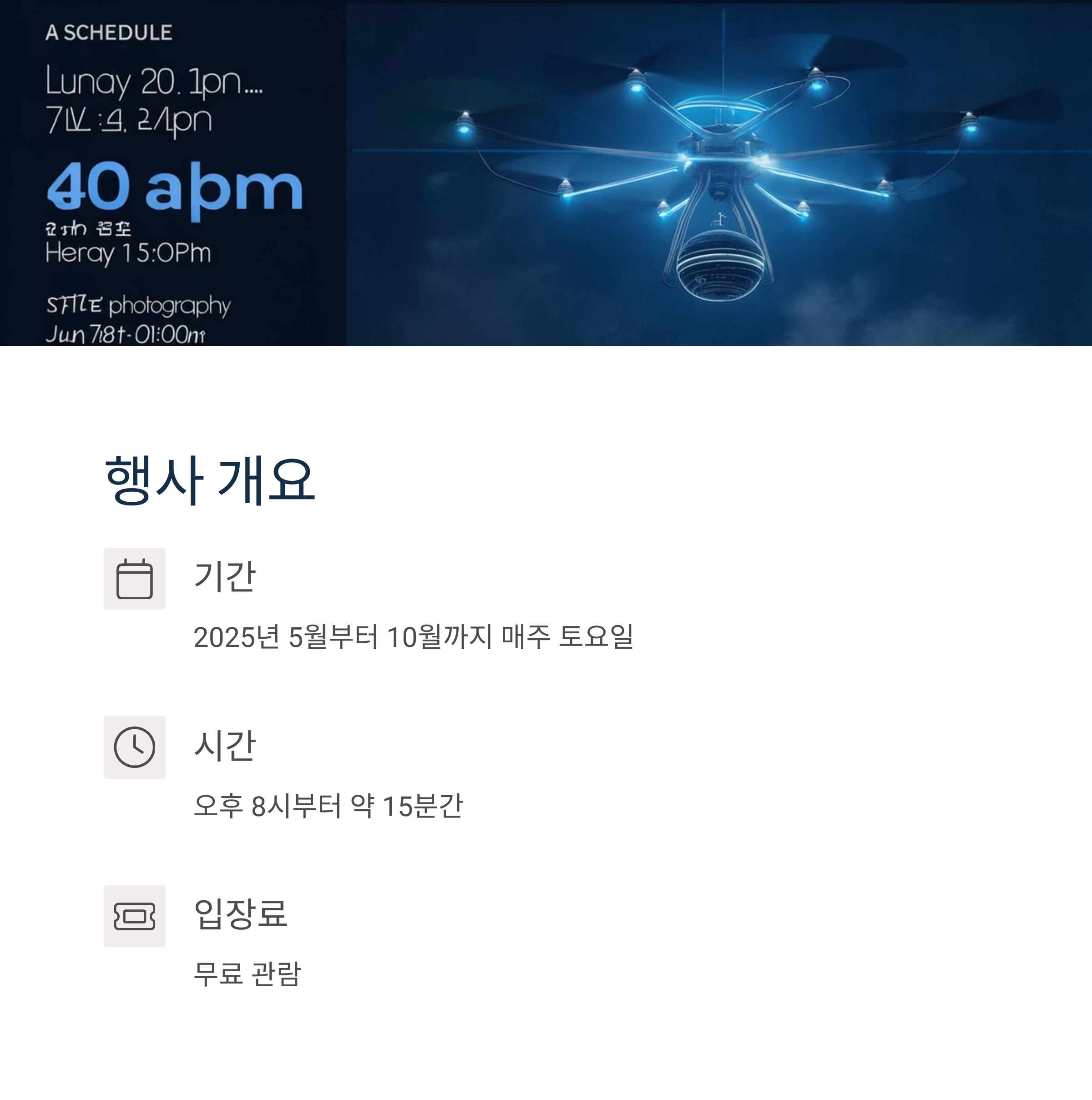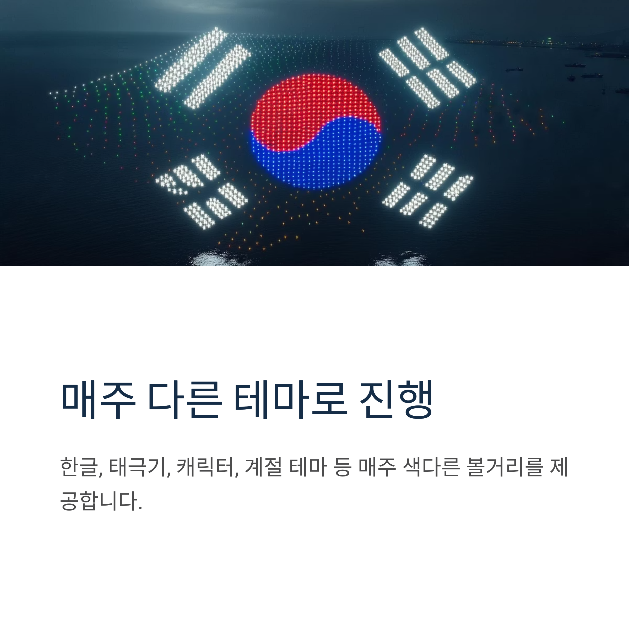 매주 다른 주제로 진행되는 드론쇼는 약 10~15분간 이어지며, 드론이 하늘에서 다양한 형상을 그리며 LED 조명을 통해 환상적인 장면을 연출합니다. 특히 한글, 태극기, 캐릭터, 계절 테마 등의 퍼포먼스는 관객들의 박수를 자아냅니다.
