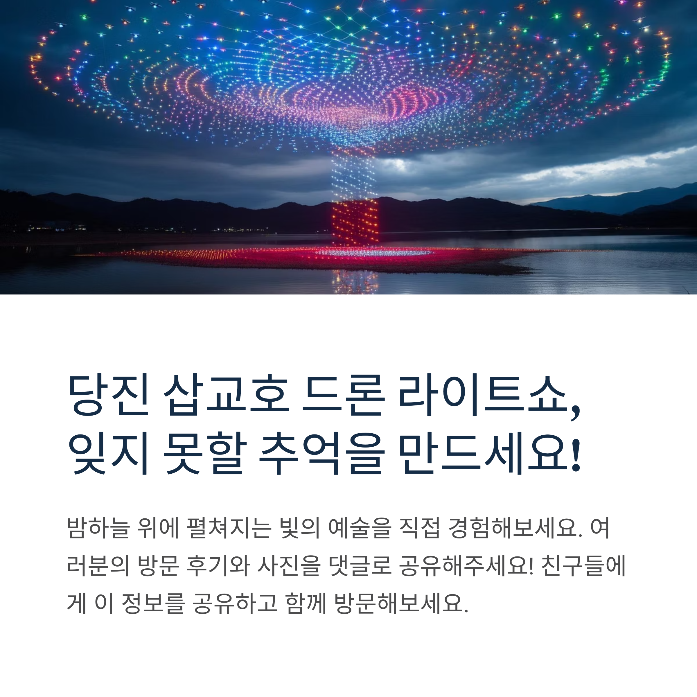 당진 삽교호 드론 라이트쇼는 단순한 야외 공연을 넘어서, 밤하늘 위에 펼쳐지는 빛의 예술입니다. 누구나 무료로 즐길 수 있으면서도 완성도 높은 퍼포먼스를 제공해 정말 강력 추천드리고 싶은 행사예요. 여유롭게 자리 잡고, 드론이 전하는 감동 메시지를 하늘에서 만끽해보세요! 실제로 보고 온 후기는 그 어떤 사진보다 생생했답니다. 여러분의 감상도 댓글로 들려주세요!