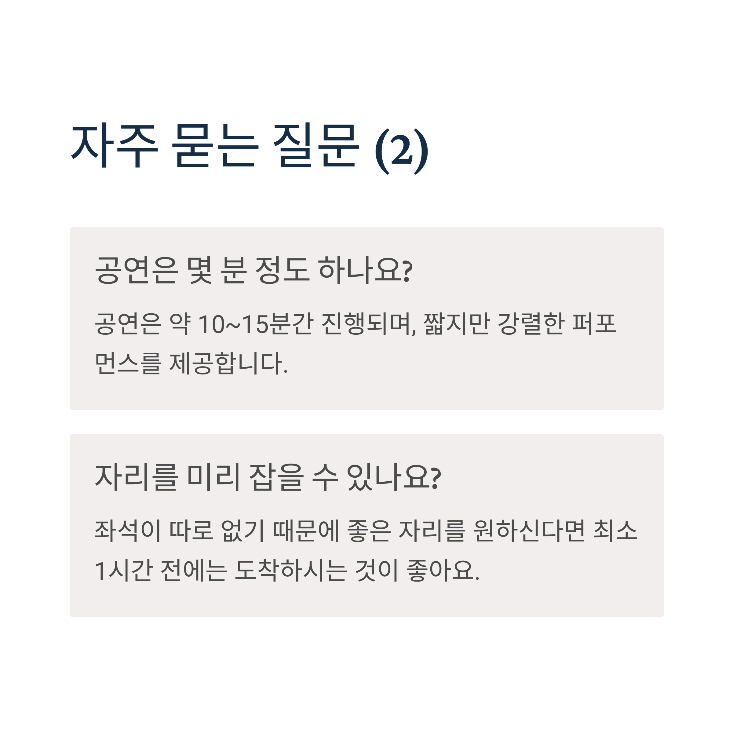 - 좌석은 지정되어 있나요? → 자유 관람이며 좌석은 없습니다.