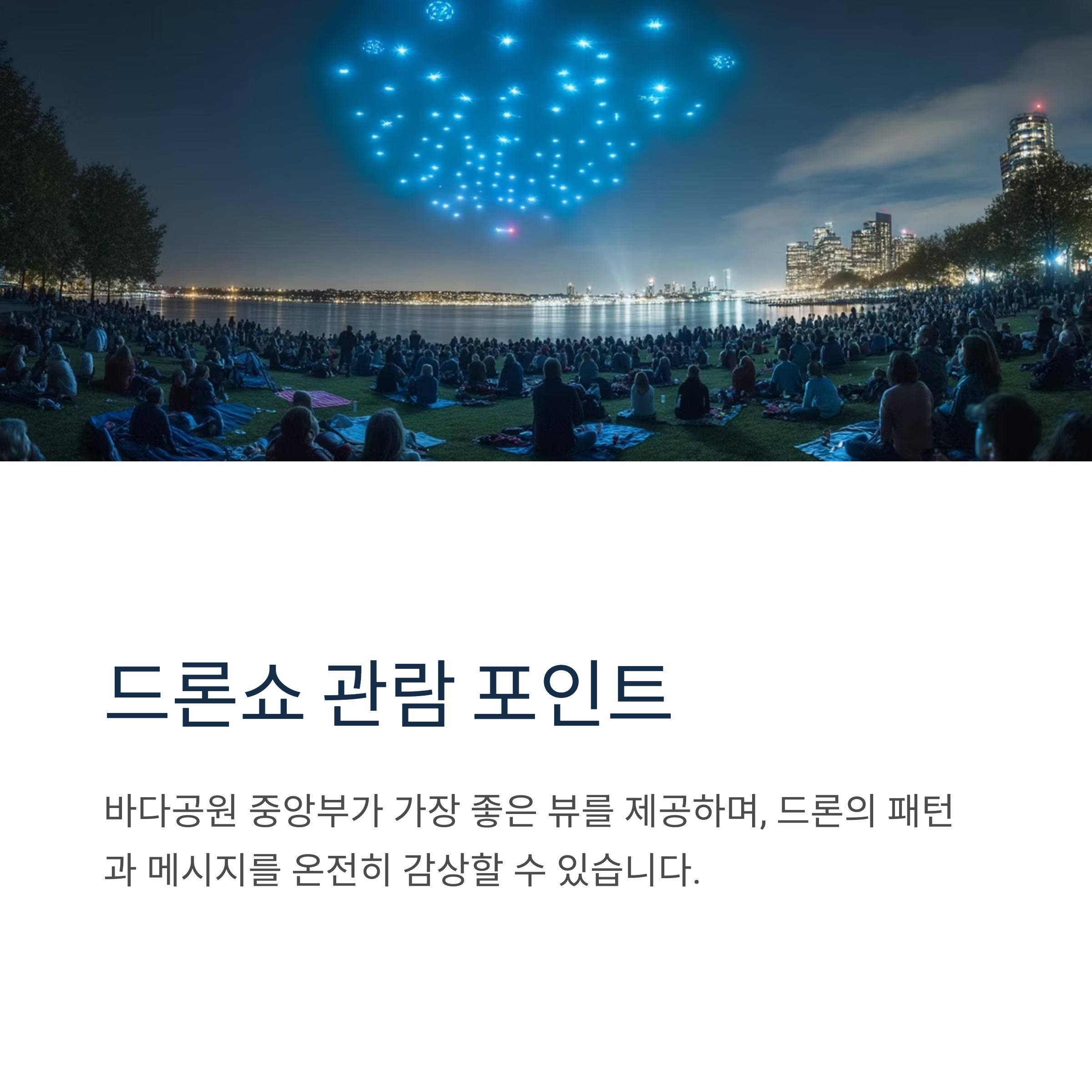 드론쇼는 야외에서 진행되기 때문에 준비물이 중요합니다. 자리를 선점하고 싶은 분은 1시간 전쯤 도착하는 것이 좋으며, 돗자리, 간단한 간식, 방석 등을 챙기면 편안한 관람이 가능합니다. 주차장과 화장실은 비교적 가까이에 있으나, 행사 당일에는 혼잡할 수 있으니 미리미리 이동하세요.