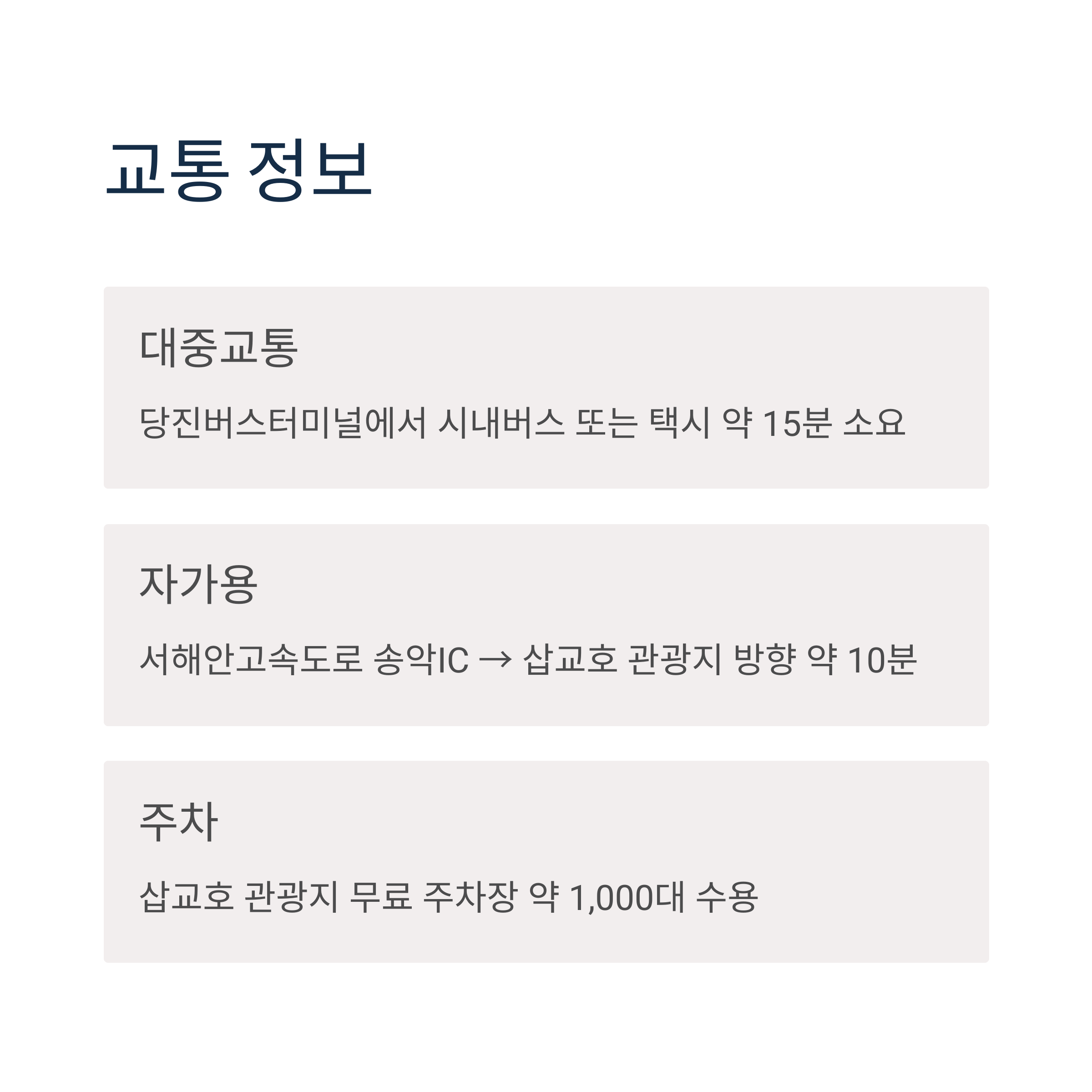 | 대중교통 | 당진버스터미널에서 시내버스 또는 택시 약 15분 소요 |